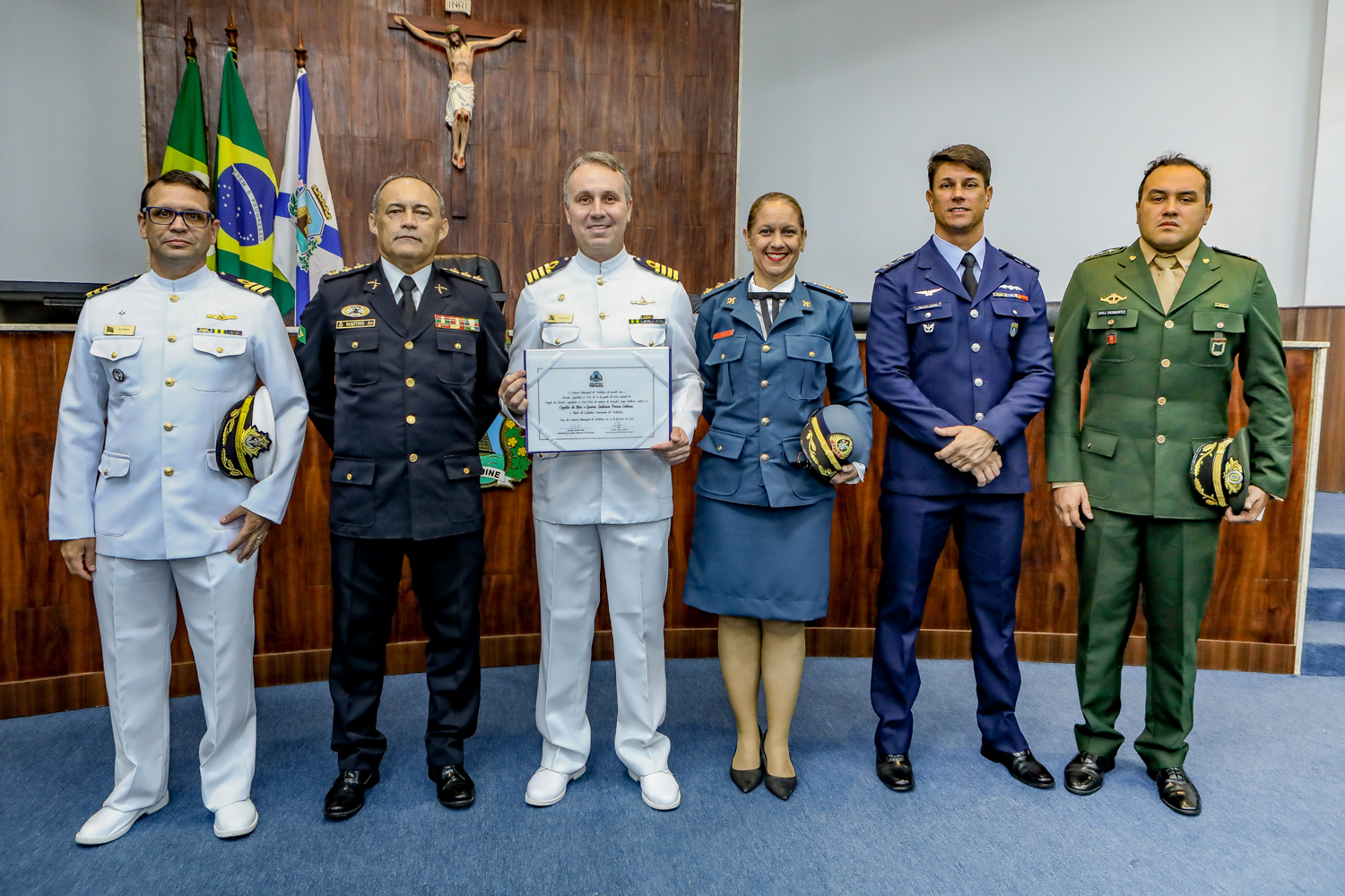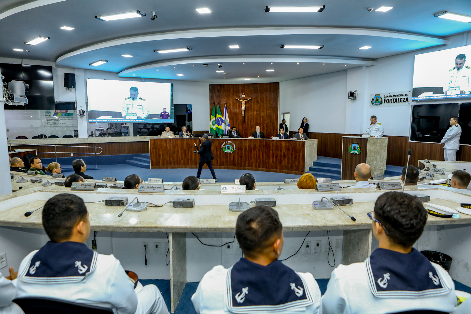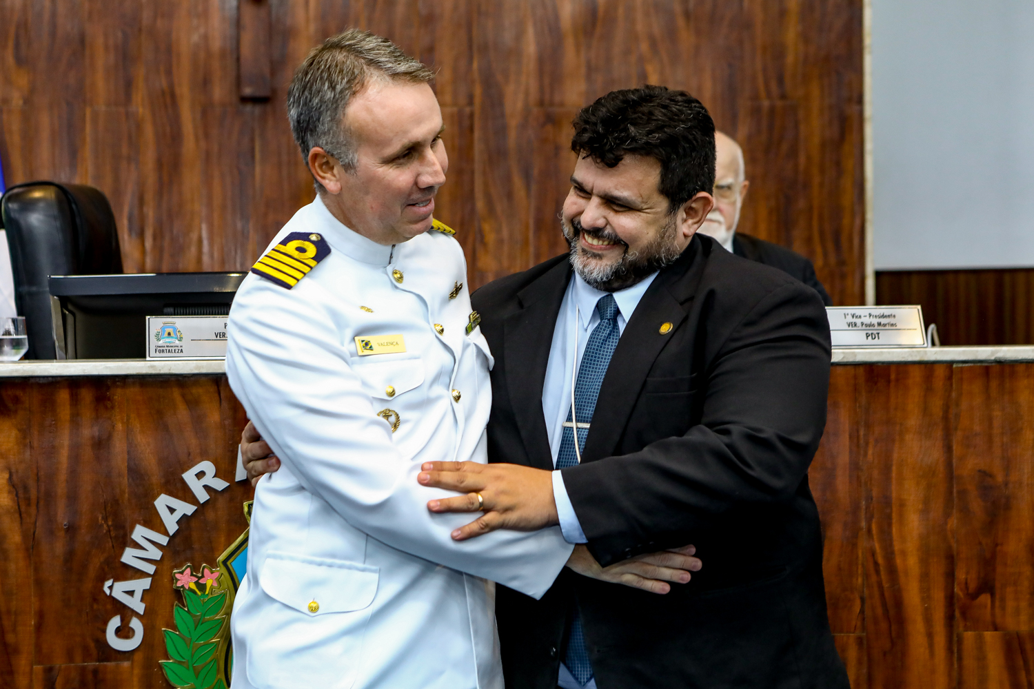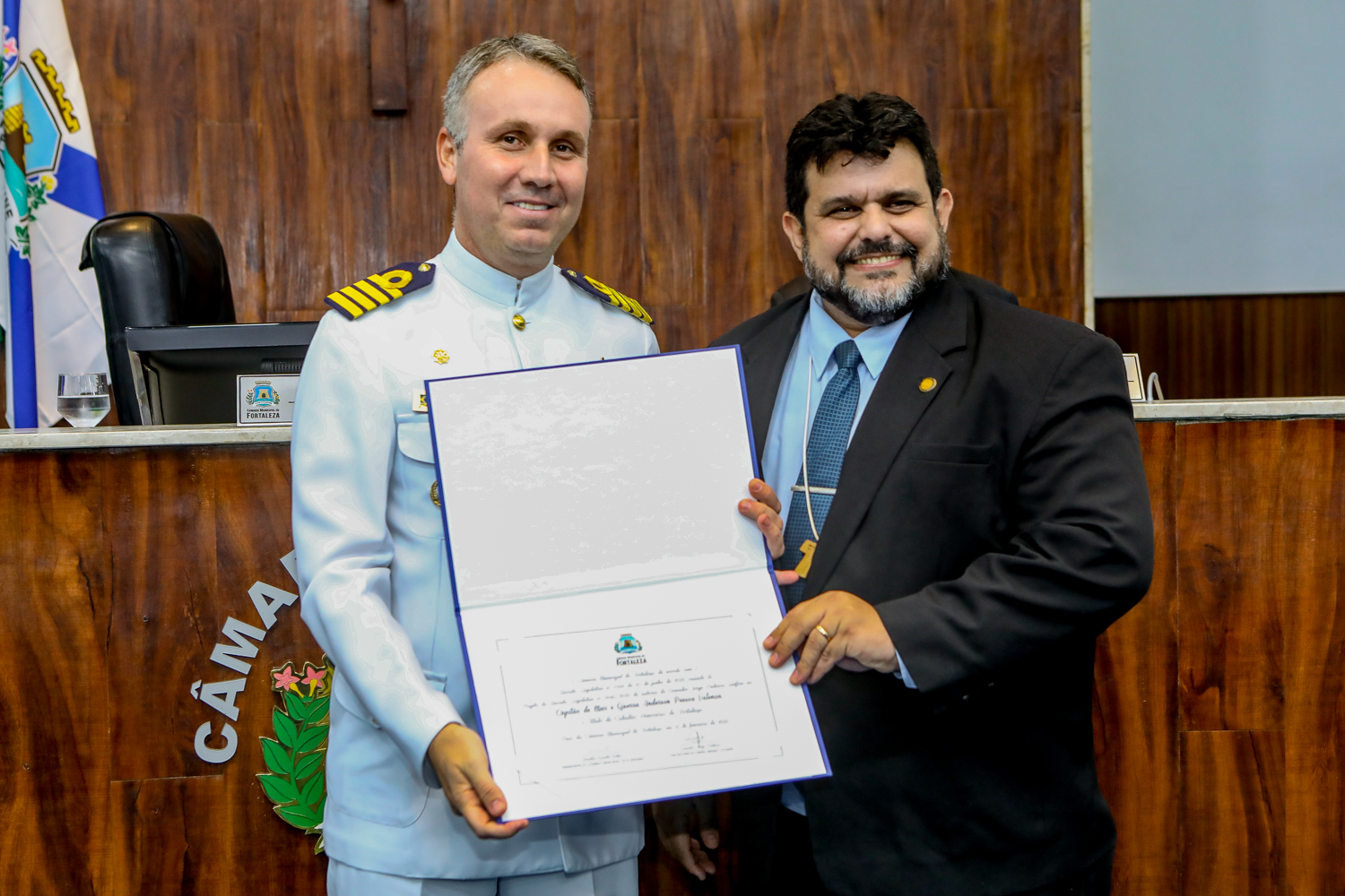 Em noite de muito prestígio, o Capitão de Mar e Guerra, Anderson Valença, recebeu o título de cidadão honorário de Fortaleza, no Plenário Fausto Arruda. A solenidade foi proposta pelo vereador Jorge Pinheiro (PSDB), que reconhece o importante trabalho realizado por Valença à frente da Capitania dos Portos do Estado. Confira os registros!