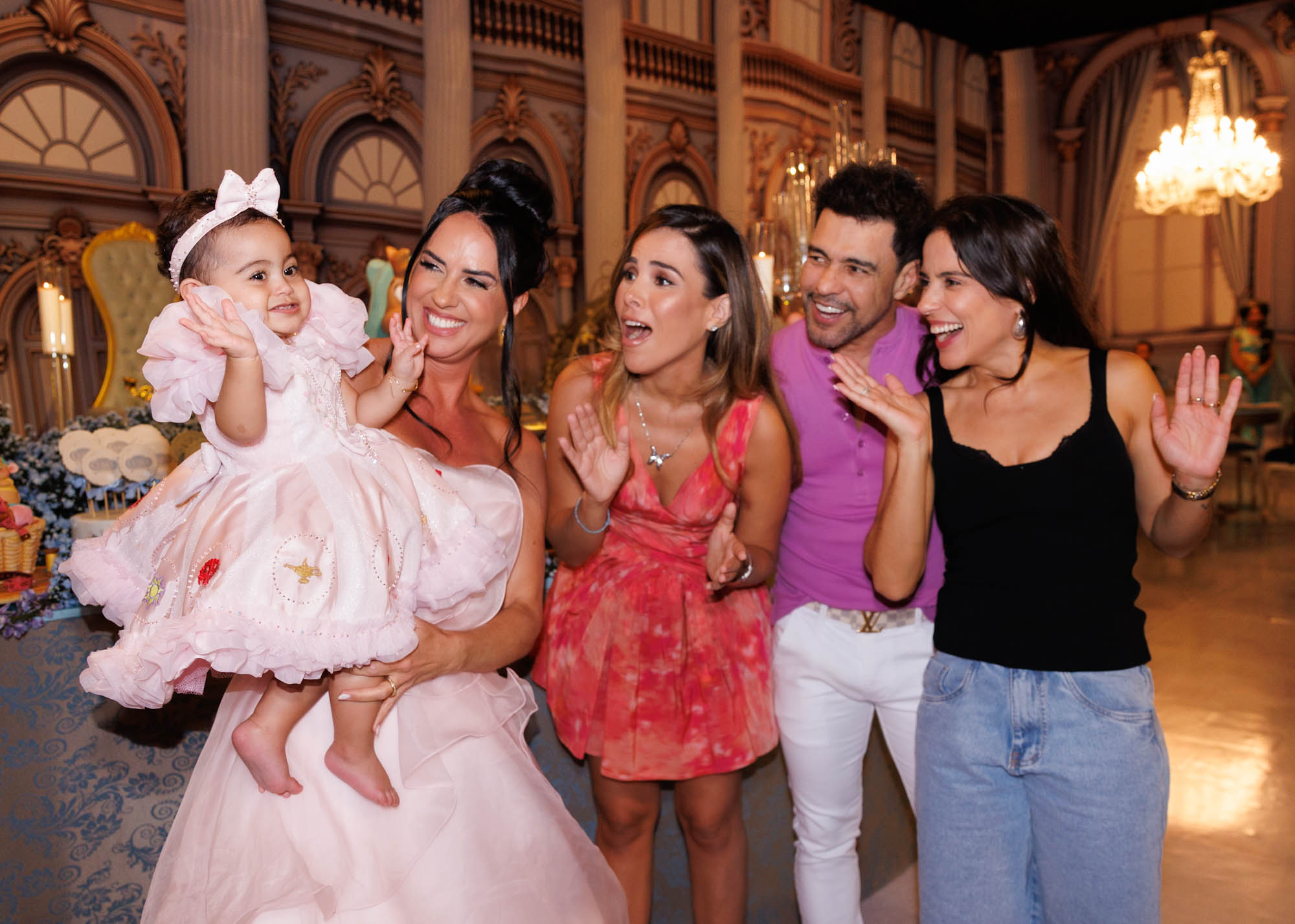 Em clima de conto de fadas, Clara, filha de Zezé Di Camargo e Graciele Lacerda, ganhou uma celebração antecipada de 1 ano neste domingo (21), em São Paulo. Embora a pequena complete aniversário no dia de Natal, a família reuniu amigos e parentes em um evento grandioso inspirado no universo da Cinderela. Graciele e Clara chegaram juntas ao salão, ambas com vestidos rosa em perfeita sintonia, reforçando a atmosfera de princesa. Zezé, que retornava de um show em Minas Gerais, fez questão de participar da comemoração em família. Entre os convidados estavam Wanessa Camargo, Camilla Camargo e os filhos. A decoração, assinada por Andrea Guimarães, transformou o espaço em um verdadeiro castelo, com personagens da Disney, flores azuis, doces personalizados e totens com registros dos mesversários de Clara. Um encerramento simbólico para a sequência de celebrações mensais idealizadas por Graciele.
