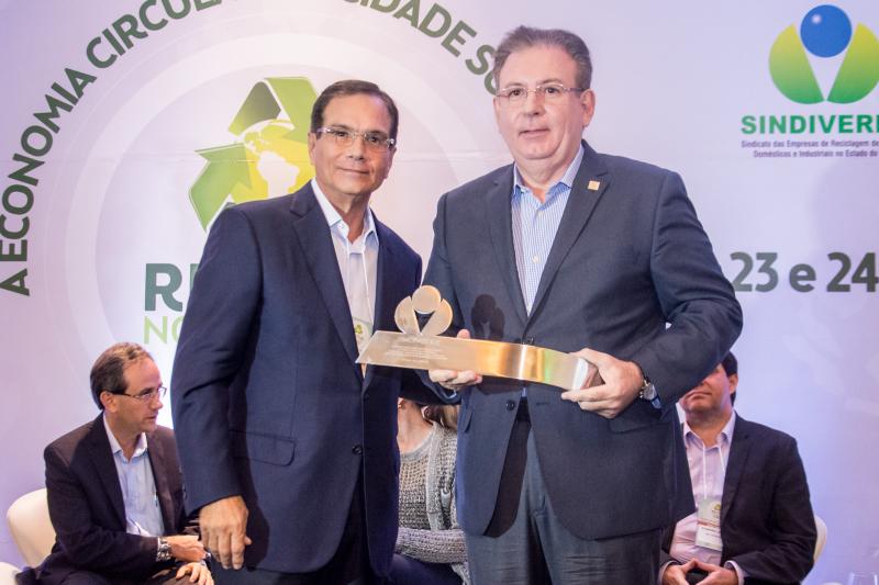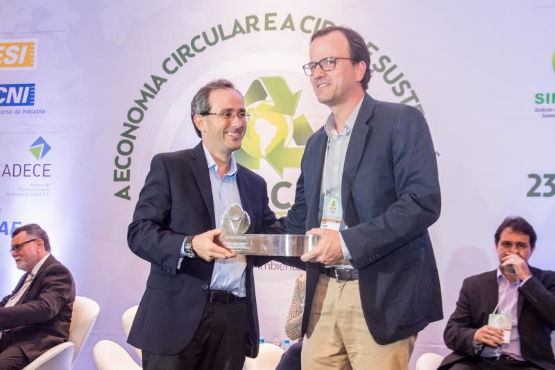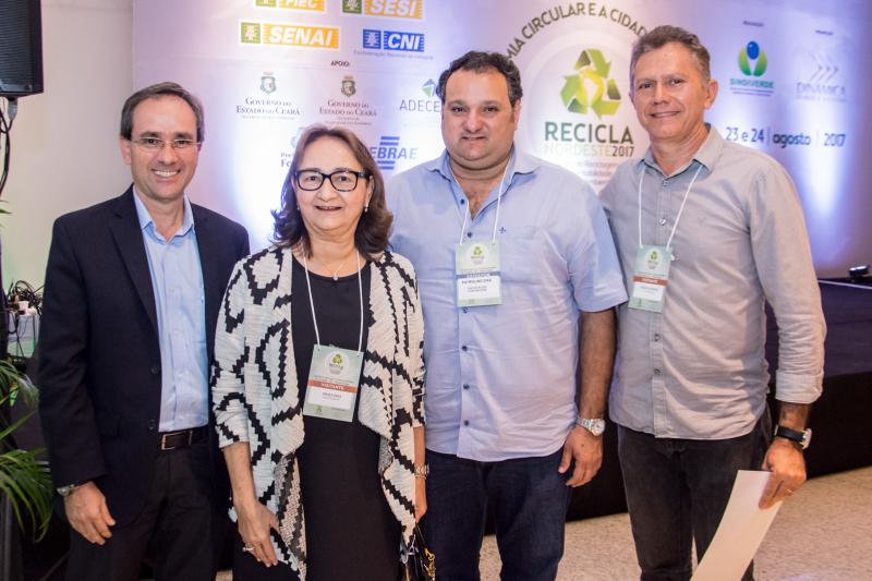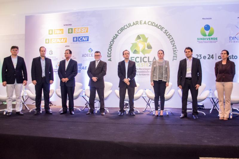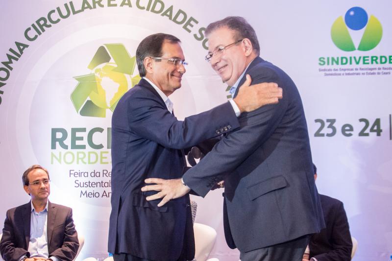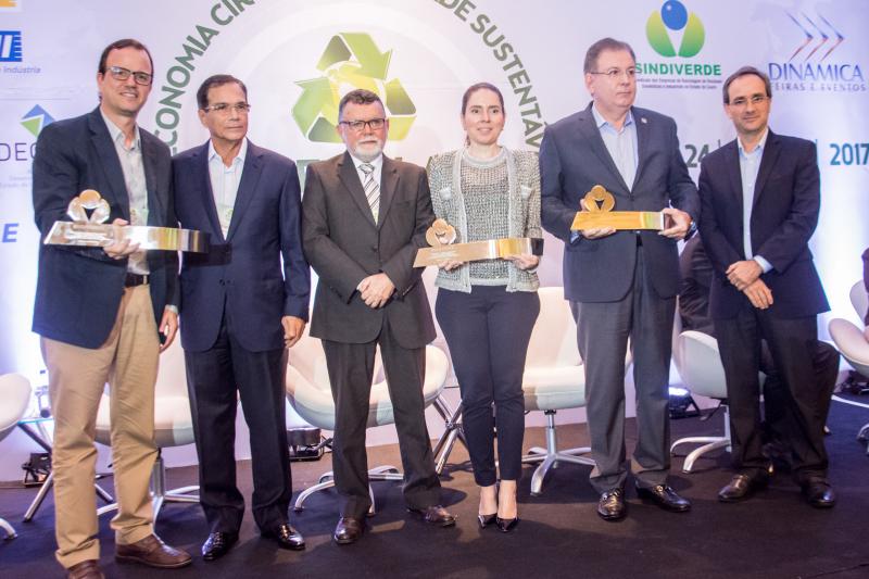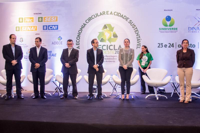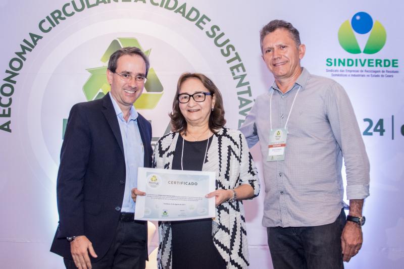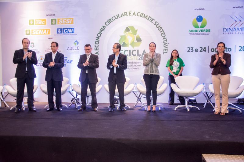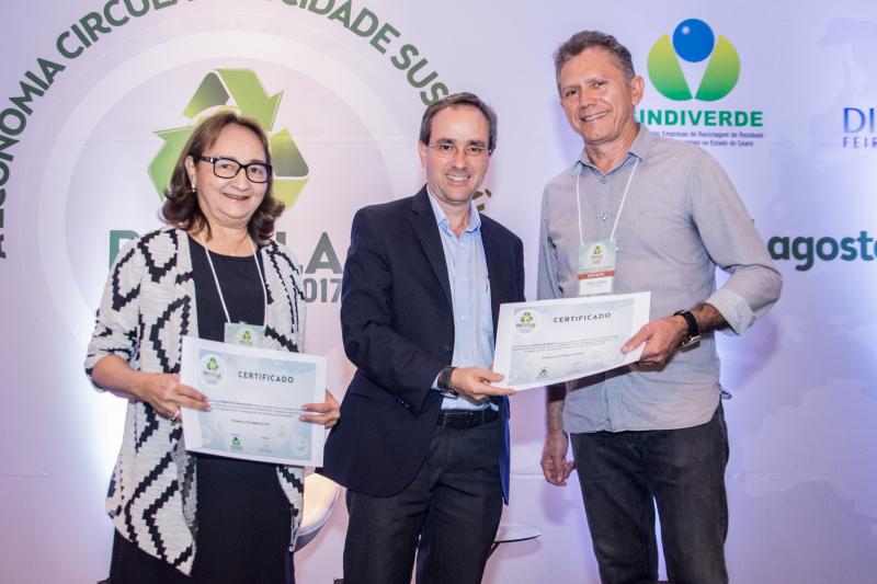 Momento de homenagem e reconhecimento em ações de sustentabilidade no Ceará marcaram a entrega do Troféu Recicla Nordeste, por ocasião do start do evento no Shopping RioMar Fortaleza. Este ano, foram agraciados o prefeito Roberto Cláudio, representado pela secretária de Meio-Ambiente e Urbanismo, Águeda Muniz, o diretor administrativo da Fiec, Ricardo Cavalcante, e o presidente do Grupo JCPM (do qual faz parte o RioMar Fortaleza), João Carlos Paes Mendonça, representado pelo superintendente Regional Ceará do Grupo JCPM, Gian Franco. Ricardo Cavalcante, que recebeu a honraria do presidente da Fiec, Beto Studart, falou em nome dos homenageados. O Recicla Nordeste é uma realização do Sindiverde, sob o comando de Marcos Albuquerque, e Dinâmica Eventos, dirigido por Sérgio Resende.