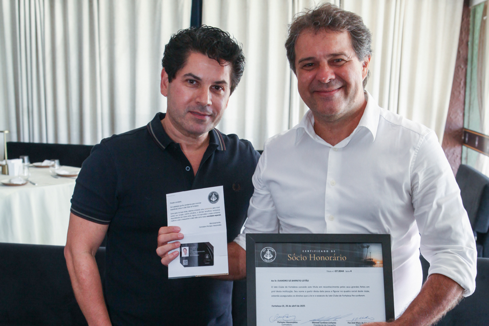 Após participar da inauguração do novo anexo do Palácio da Luz, que agora abriga uma réplica do histórico Café Java, o prefeito de Fortaleza, Evandro Leitão (PT), seguiu para uma recepção especial no Iate Clube de Fortaleza. No encontro, realizado no sábado (26), o gestor foi agraciado com o título de Sócio Honorário da instituição, em reconhecimento à sua contribuição para o fortalecimento da cultura e do turismo na cidade.