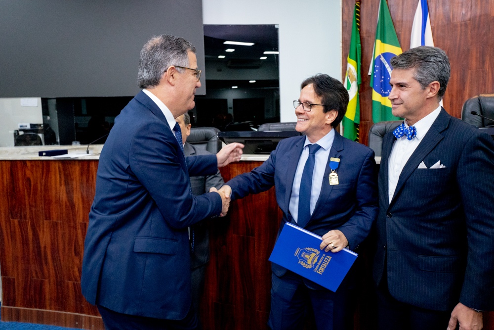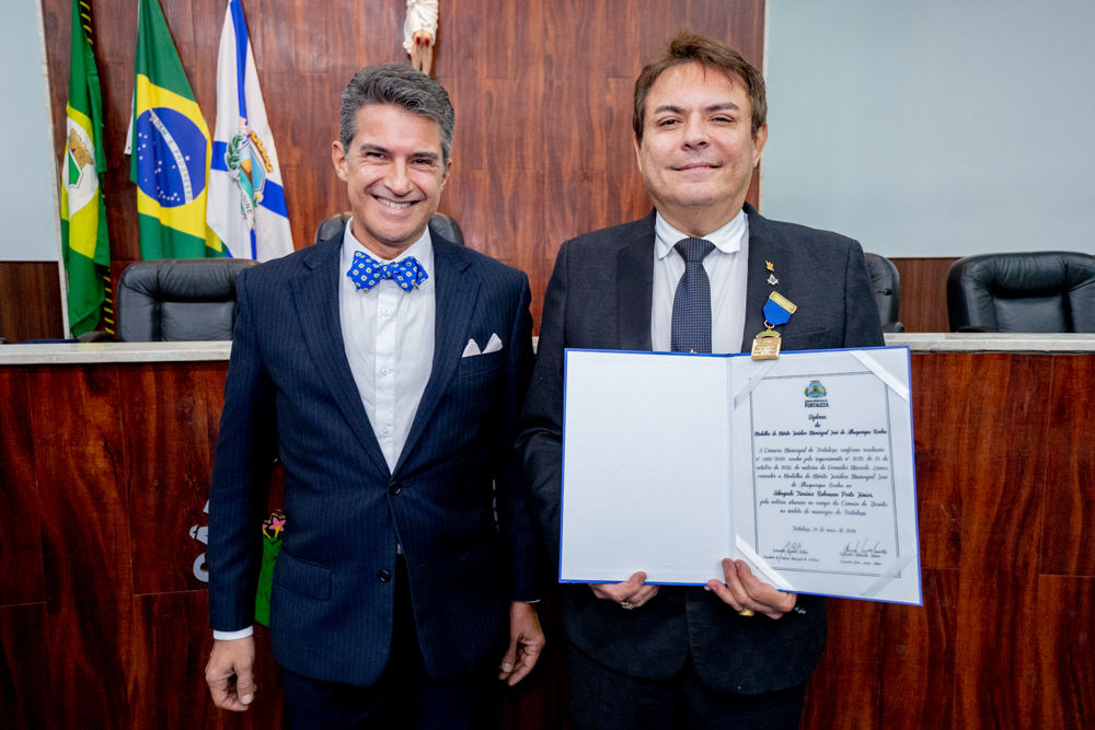 A Câmara Municipal de Fortaleza entregou as Medalhas do Mérito Jurídico Municipal José de Albuquerque Rocha aos advogados Tarcísio Rebouças Porto Junior e Walmar Carvalho Costa e em uma Sessão Solene no Plenário Fausto Arruda, na quarta-feira (29). A homenagem foi proposta pelos vereadores Marcelo Lemos (Avante) e Paulo Martins (PDT). O vereador Marcelo Lemos enalteceu as conquistas de Tarcísio Porto ao longo de seus 35 anos de serviço jurídico em Fortaleza. Tarcísio Porto expressou sua gratidão pela honraria e lembrou do recebimento da Comenda Boticário Ferreira recebida da casa do povo em 2021. O vereador Paulo Martins destacou a dedicação de Walmar Costa em sua carreira de mais de 37 anos na advocacia. Walmar agradeceu o reconhecimento e celebrou sua parceria profissional de longa data com Tarcísio Porto. A sessão solene contou com a presença de diversas autoridades do setor jurídico. Após a cerimônia, os homenageados celebraram a conquista no Restaurante do Ideal Clube de Fortaleza com amigos e familiares. Confira registros da recepção.
