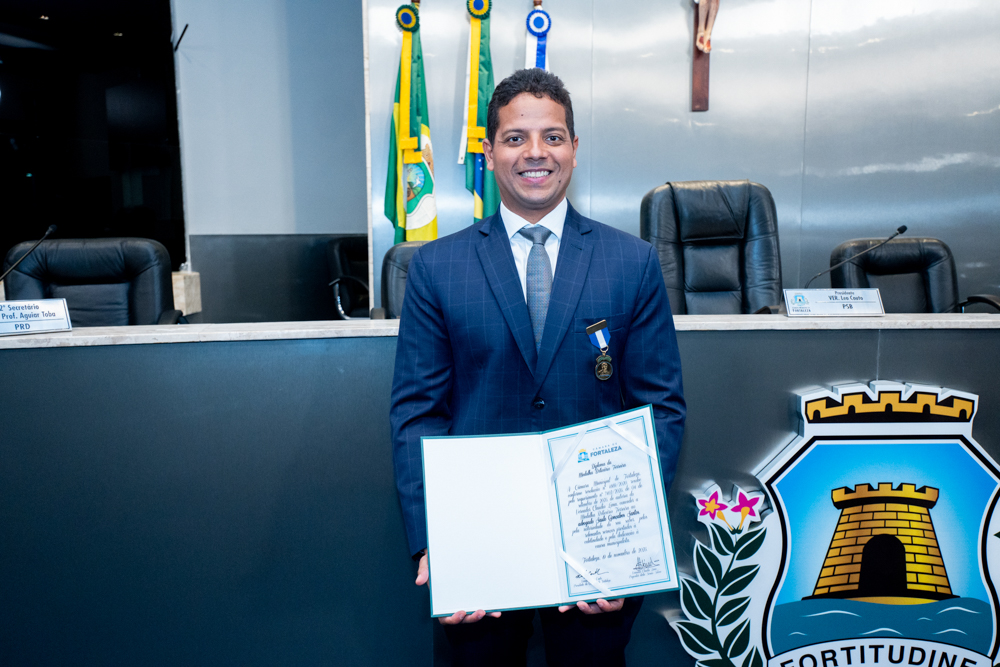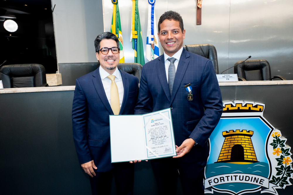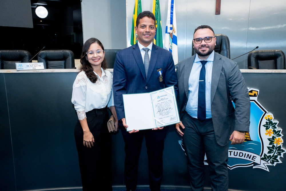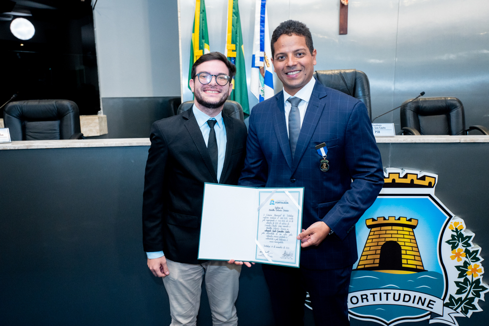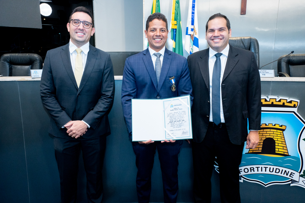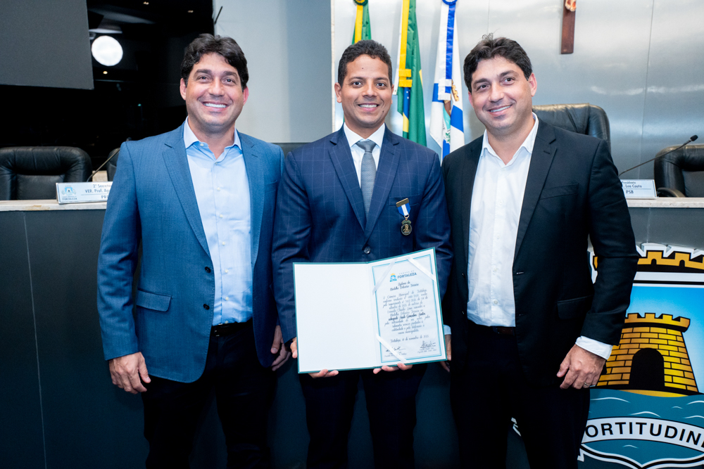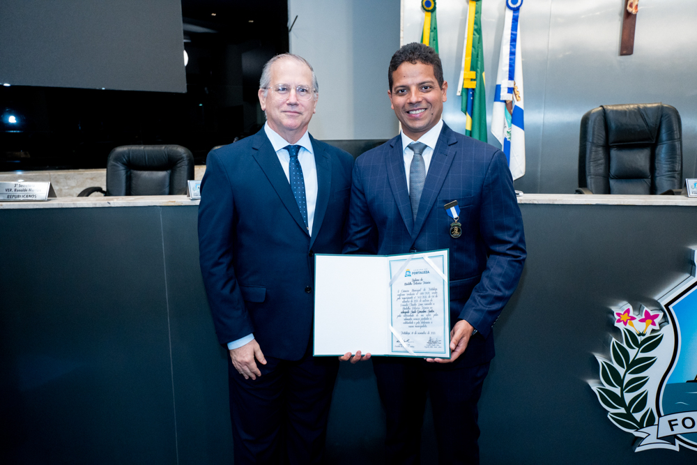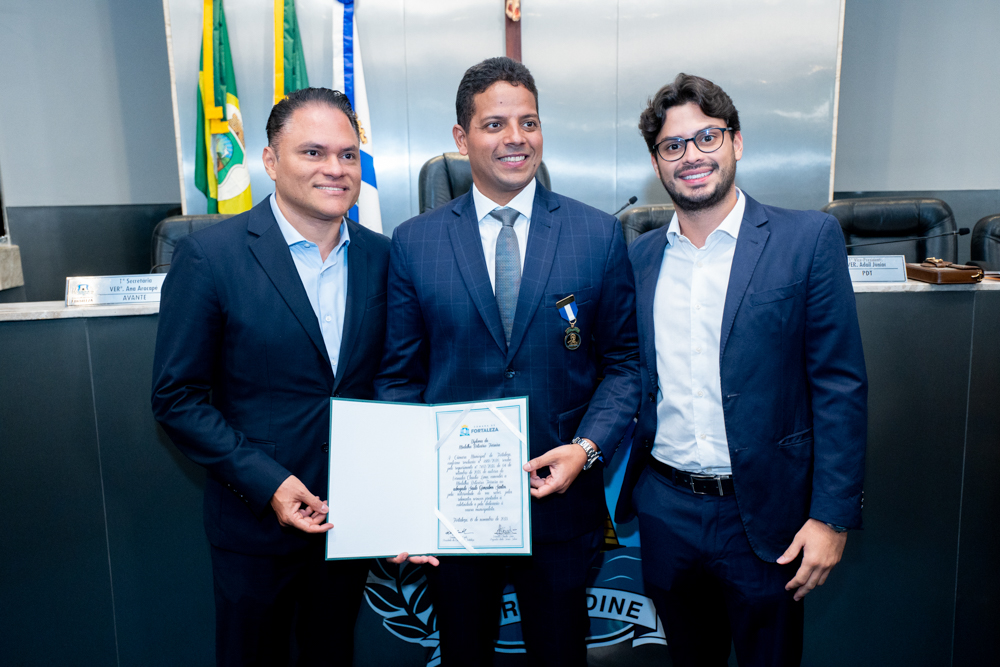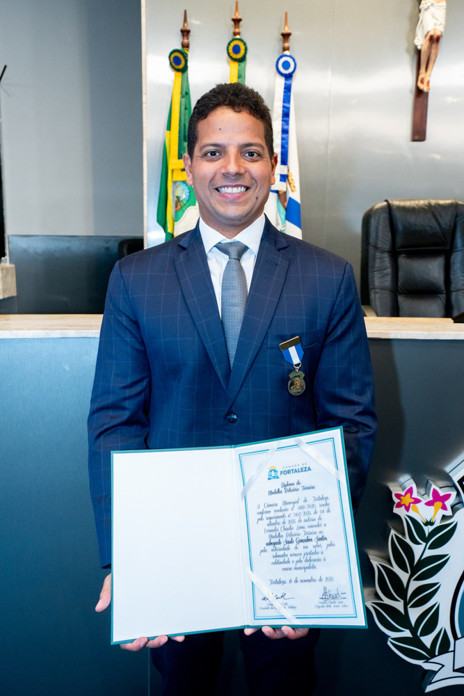 Autoridades da política e do judiciário reuniram-se na quarta-feira (19), no Plenário Fausto Arruda, da Câmara Municipal de Fortaleza, para acompanhar a sessão solene que outorgou a Medalha Boticário Ferreira ao advogado cearense Saulo Gonçalves Santos. A distinção ressaltou a contribuição do procurador do município de Caucaia, cuja trajetória no Direito Público e Tributário se entrelaça à pesquisa acadêmica e à experiência na magistratura cearense. Proposta pelo vereador Cláudio Lima e conduzida pelo presidente da Câmara, Leo Couto (PSB), a solenidade foi prestigiada pelos desembargadores Raimundo Nonato Silva Santos, Francisco Mauro Ferreira Liberato e Cid Marconi.