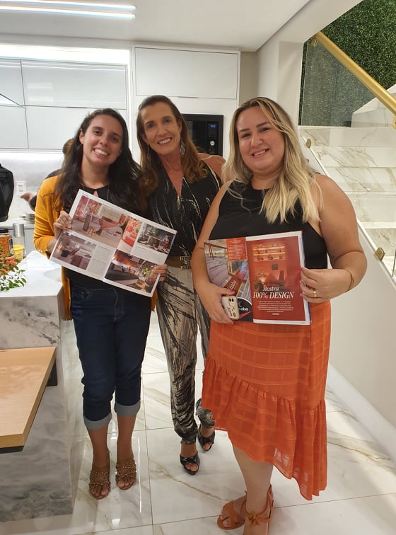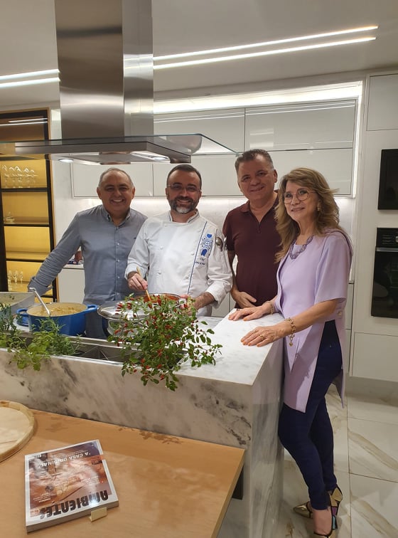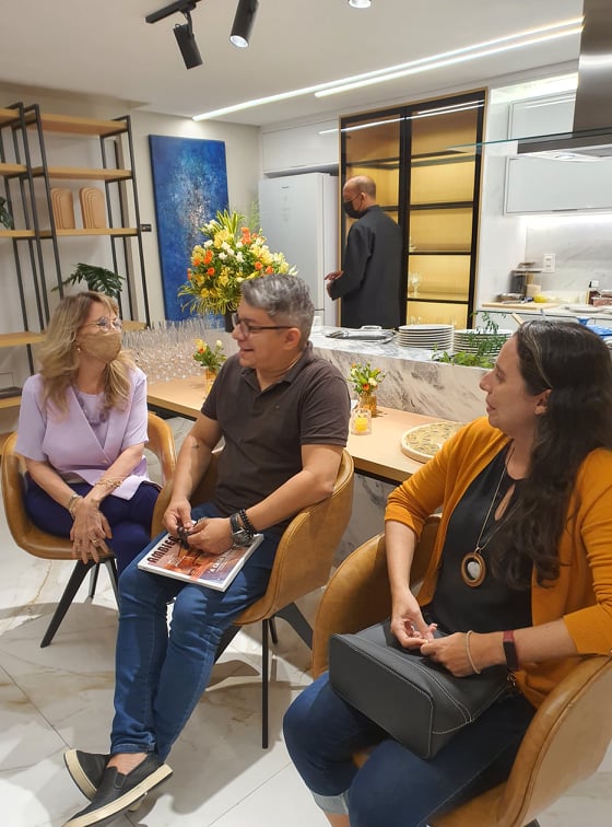 Carlos e Renata Freitas, heads da loja Romanzza Fortaleza, receberam Omar de Albuquerque, Sofia Linhares e todo o time de arquitetos e designers da Mostra 100% Design no caprichoso coquetel de lançamento da Revista Ambientes. A edição da revista traz a cobertura completa da edição 2021 da mostra, que aconteceu no mês de outubro no Shopping RioMar Fortaleza. O meeting contou com a participação do chef Luiz de França, que elaborou um cardápio a base de massas e molhos para os convidados especiais, além da música animada da deejay Gabi Gabilônia. Confira os clicks a seguir!