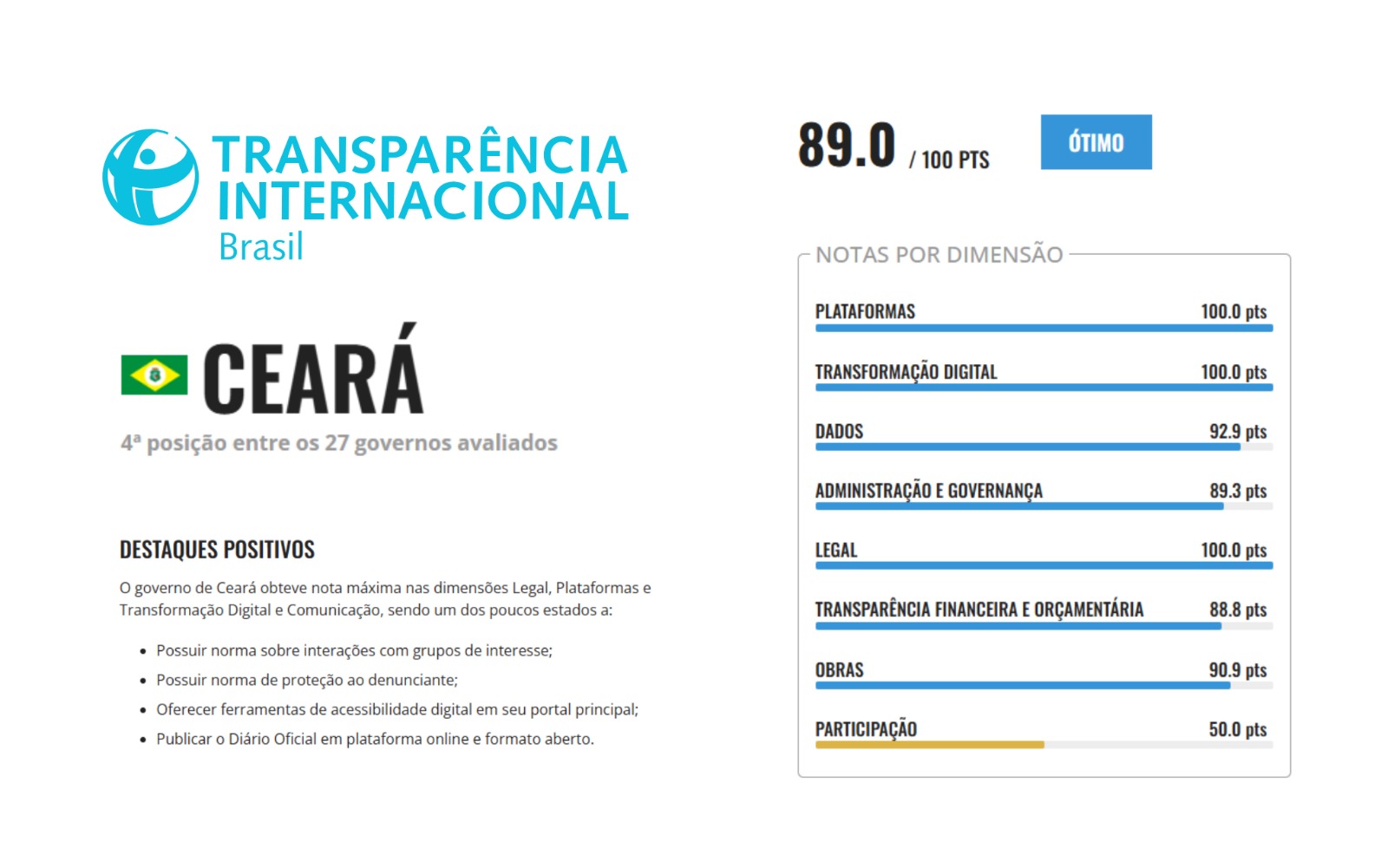 O Ceará conquistou a 4ª colocação nacional no Índice de Transparência e Governança Pública (ITGP) 2025, elaborado pela Transparência Internacional Brasil. O Estado somou 89 pontos de um total de 100 possíveis, desempenho que garantiu a classificação na categoria “Ótimo”.