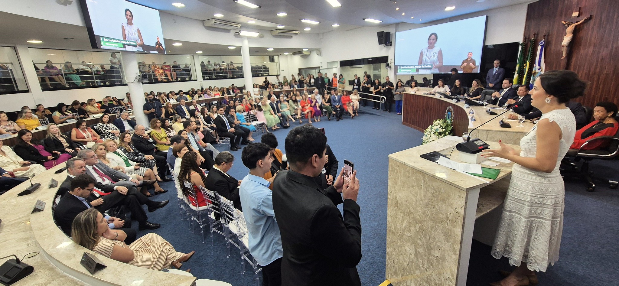 Lia de Freitas faz seu discurso de agradecimento para um plenário lotado. Foto: André Lima/CMFor