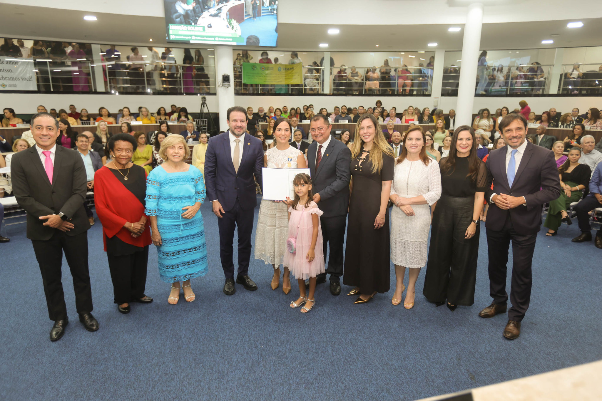 Lia de Freitas com a filha, Maria Beatriz, de seis anos, sendo aplaudida pelo presidente Leo Couto. Foto: André Lima/CMFor