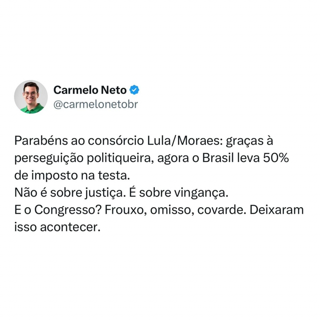 Ele criticou ainda o Congresso e o STF, em referência à aliança entre Lula e o ministro Alexandre de Moraes: “Parabéns ao consórcio Lula/Moraes: graças à perseguição politiqueira, agora o Brasil leva 50% de imposto na testa. Não é sobre justiça. É sobre vingança. E o Congresso? Frouxo, omisso, covarde. Deixaram isso acontecer”