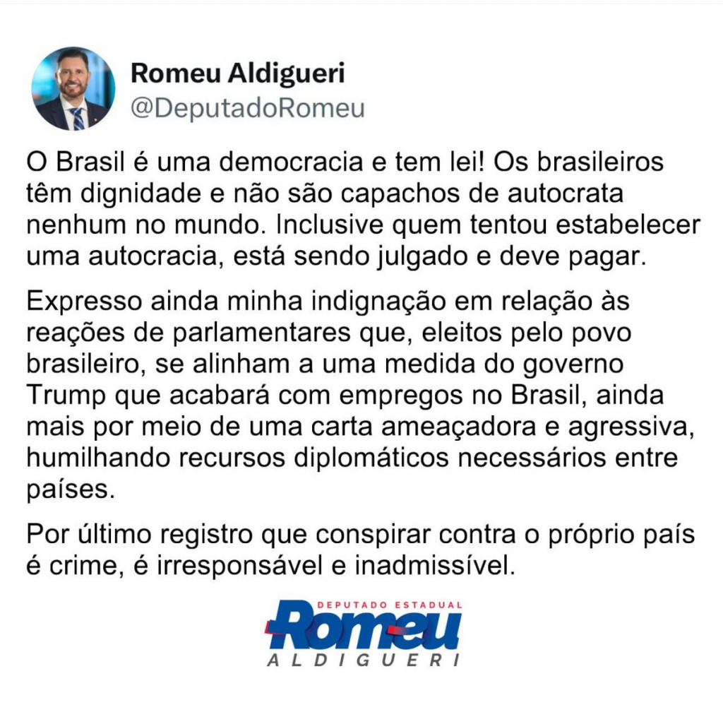 “O Brasil é uma democracia e tem lei! Os brasileiros têm dignidade e não são capachos de autocrata nenhum no mundo. Inclusive quem tentou estabelecer uma autocracia, está sendo julgado e deve pagar. Expresso ainda minha indignação em relação às reações de parlamentares que, eleitos pelo povo brasileiro, se alinham a uma medida do governo Trump que acabará com empregos no Brasil, ainda mais por meio de uma carta ameaçadora e agressiva, humilhando recursos diplomáticos necessários entre países”.