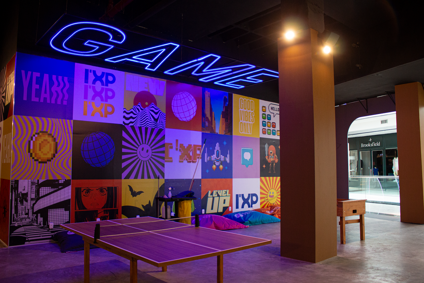 No local, painéis coloridos chamam a atenção por fazer referência aos jogos mais famosos do mundo. O projeto do espaço também é composto por espaços geométricos, pensado para o conforto e conexão das pessoas.