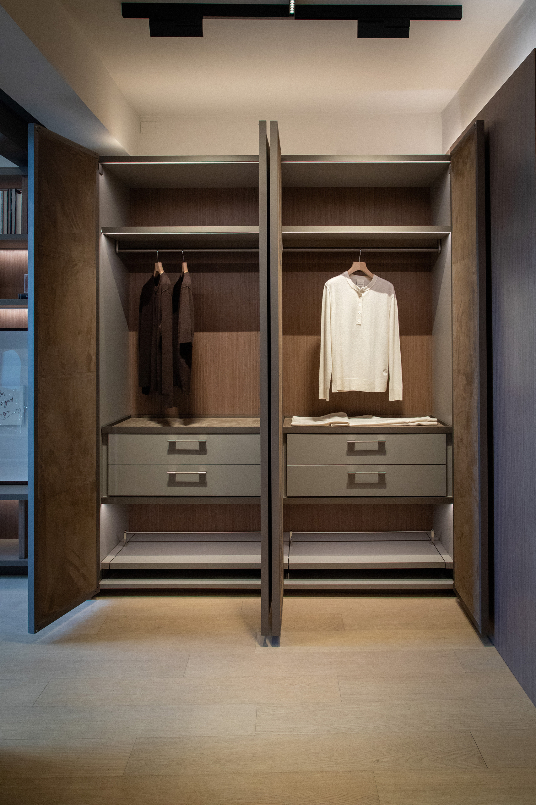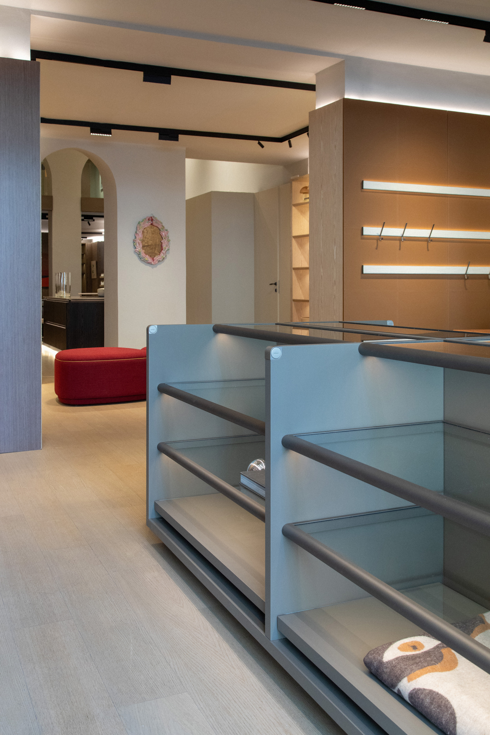 A proposta indica uma mudança de posicionamento. Em vez de destacar apenas lançamentos, a marca estrutura um ambiente onde o mobiliário assume papel dentro de um sistema mais amplo, conectado ao comportamento contemporâneo de habitar. Closets e cozinhas surgem como arquiteturas domésticas, com soluções que exploram transparência, integração e uso da luz como elemento construtivo.