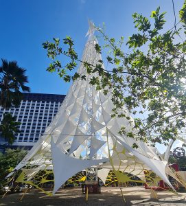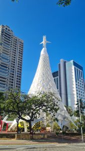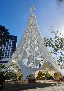 As árvores de natal que compõem o Projeto Ceará Natal de Luz terão nesse ano de 2023, como temática a exploração visual do elemento vela. O bailar, no constante ir e vir, das embarcações e jangadas do litoral cearense marcarão presença na decoração natalina local. Lançar-se ao mar, impulsionados somente pela força e direcionar dos ventos, nos evidenciam com grandeza e coragem o espírito arrojado e desbravador da figura do pescador. Seja durante o dia, orientados pelo surgir da estrela maior, o sol, ou a noite, guiados pelo infinito teto de luzes piscantes. Visualizando este cenário, é fácil nos permitimos fazer um paralelo entre estes navegantes do desconhecido e os reis magos, que guiados pelo brilhar da estrela da Vida, partem decisivos ao encontro da Promessa Maior, ao encontro do Novo, ao encontro da Esperança. É nessa abordagem leve e simples, que a autenticidade e beleza do regionalismo apresenta-se tradicionalmente adornando as árvores de natal nas Praças do Ferreira e Portugal em Fortaleza. Sua volumetria cônica é revestida com tecido tipo lycra, na cor branca. O tecido de elasticidade tem suas extremidades presas e tensionadas aos cabos, promovendo um efeito 3d, que se alternam em diferentes dimensões com silhuetas triangulares que lembram o formato de uma vela.