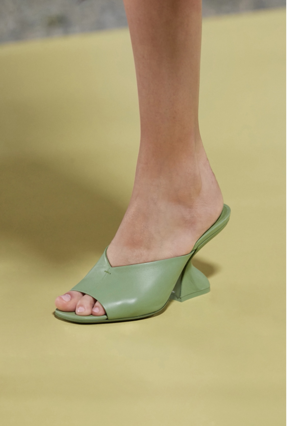 O sapato F-heel 2021 compartilha a forma curvada do calcanhar original que, engenhosamente, parece deixar o pé do usuário andando no ar. Ele é feito em napa em cores ousadas, porém brilhantes como Verde Hedren e Amarelo Technicolor. Uma outra fabricação é feita em napa preta pontuada por contas peroladas.
