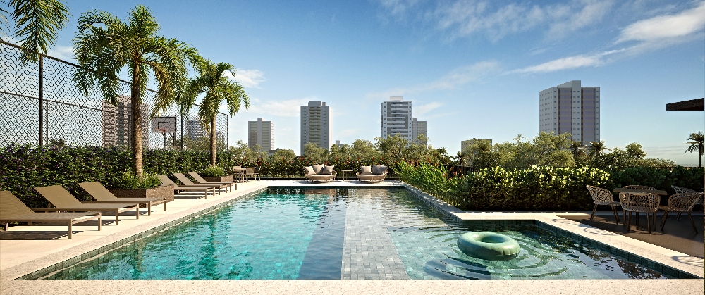 A experiência começa desde o acesso, onde jardins integrados criam uma atmosfera acolhedora. Já o pavimento de lazer elevado reúne vistas amplas da Aldeota e espaços dedicados à convivência, ao descanso e às atividades ao ar livre. Praças mobiliadas complementam o conjunto, ampliando as possibilidades de uso das áreas comuns e reforçando a sensação de bem-estar.
