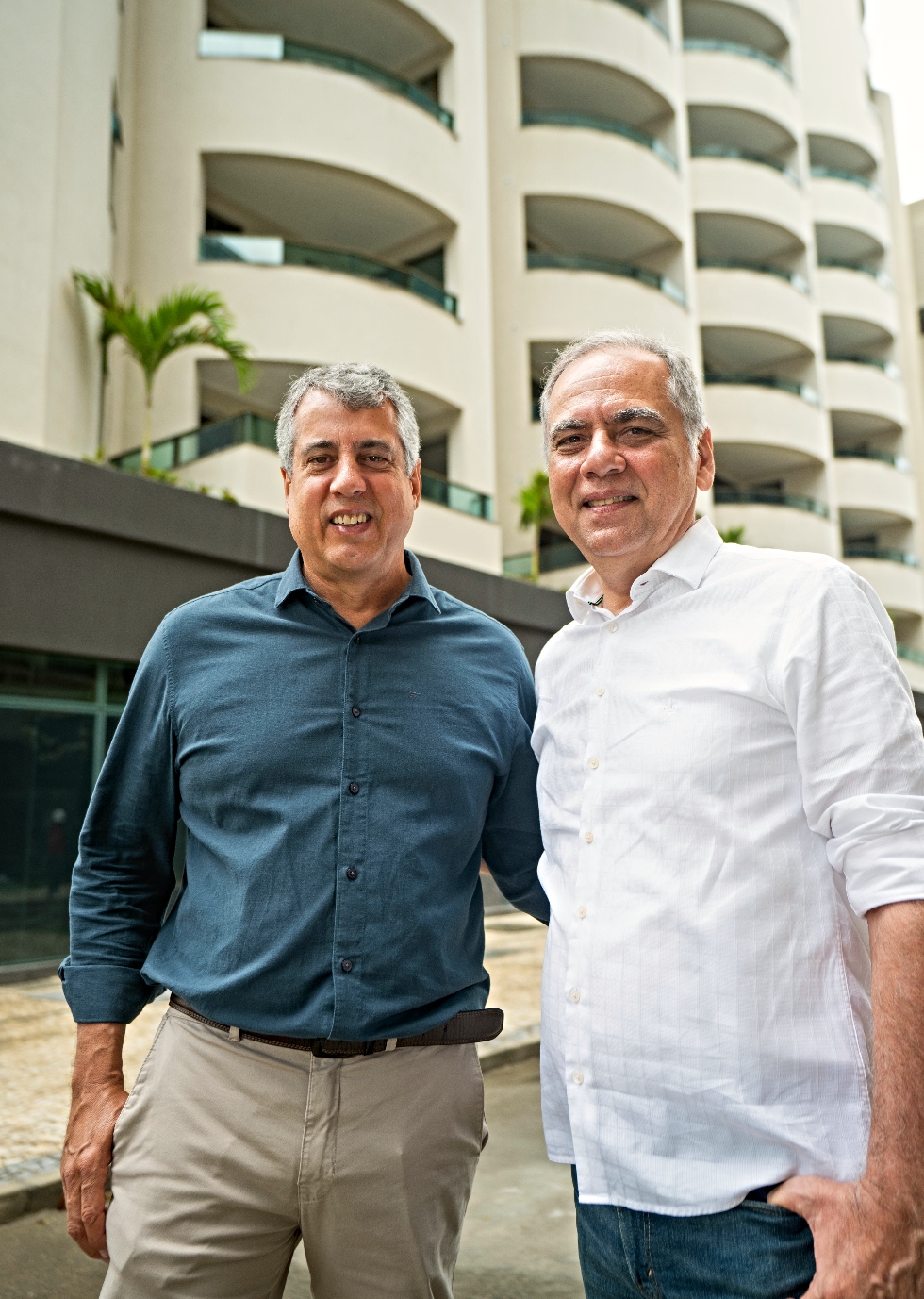 Eduardo Moura e Bruno Ferraz em frente ao empreendimento entregue na semana passada em Recife Fotos: Sol Pulquério/Divulgação