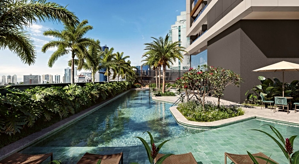 O projeto arquitetônico do Beach Class Bahia leva a assinatura de Ricardo Farias, com ambientação de interiores desenvolvida por Humberto Zirpoli e paisagismo de Benedito Abbud. O pavimento de lazer contará com lobby de pé-direito duplo, piscina com raia, quadra de beach tennis e espaço para restaurante. Já o mezanino concentrará serviços como coworking, lavanderia compartilhada, mini market, pet wash e a área de governança.