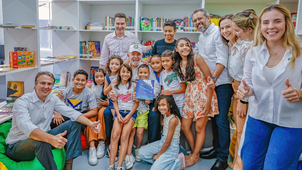 Lula com crianças e demais autoridades na biblioteca situada no Residencial Cidade Jardim