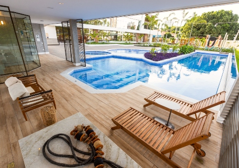 Área das piscinas é um destaque e conta com uma delas aquecida