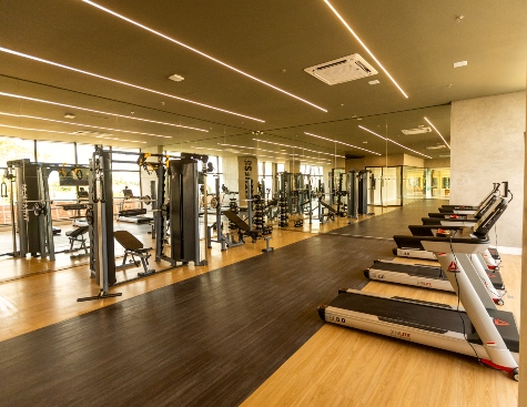 • Complexo Fitness é uma experiência à parte: existe um pavimento inteiro (440m²), com pé-direito estendido, para diversas modalidades esportivas. Já os amantes de corrida poderão desfrutar da pista de cooper com mais de 200 metros e depois se refrescar em uma das três piscinas, uma delas inclusive, aquecida.