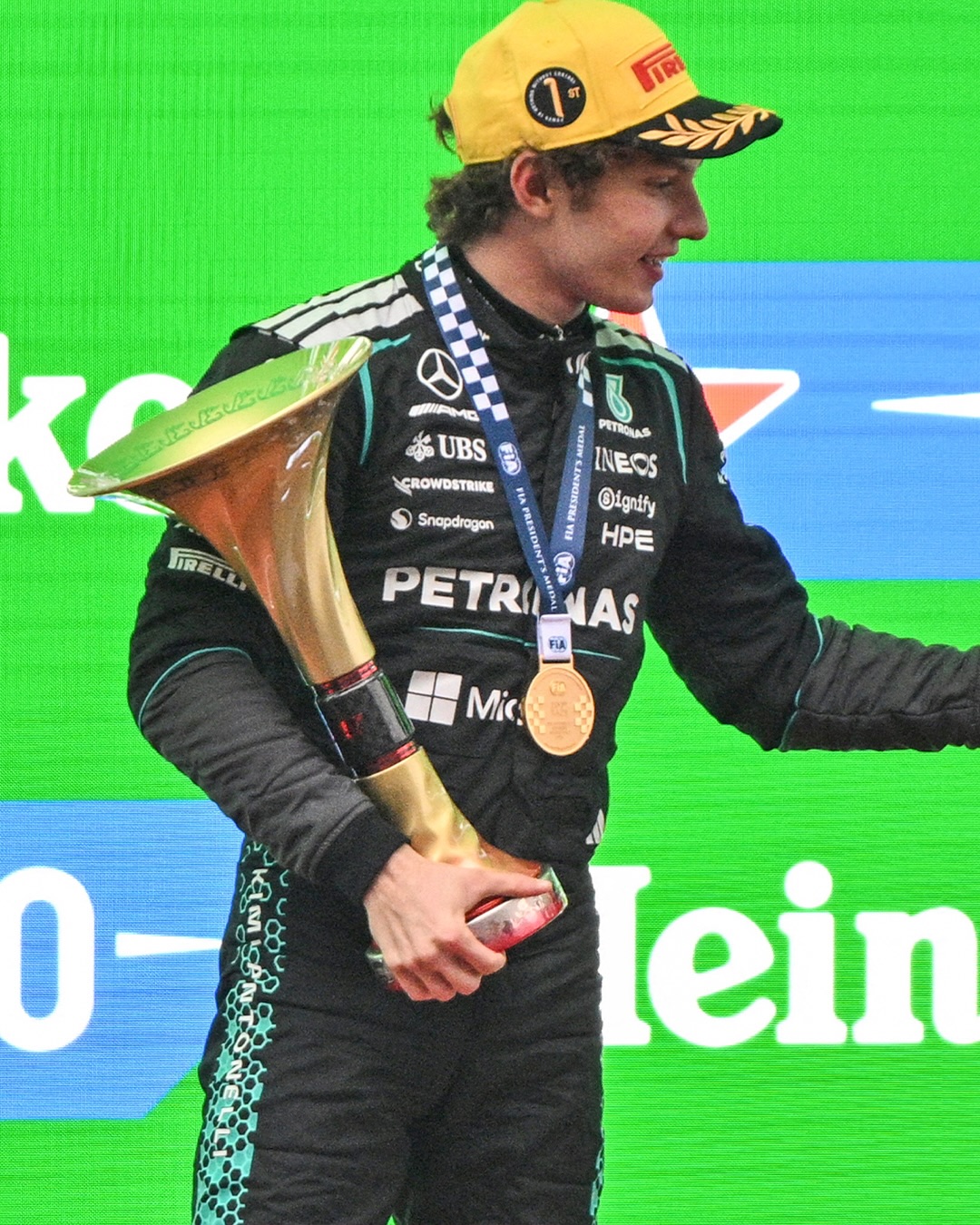 Aos 19 anos, Antonelli já havia entrado para os livros da Fórmula 1 no sábado (14) ao se tornar o piloto mais jovem da história a conquistar uma pole position. No domingo, confirmou o desempenho ao liderar grande parte da corrida e cruzar a linha de chegada à frente do companheiro de equipe George Russell, garantindo a dobradinha da Mercedes. Lewis Hamilton, agora pela Scuderia Ferrari, completou o pódio.