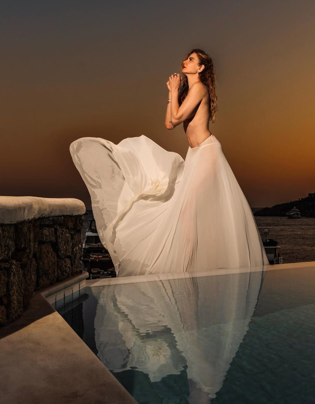 A apresentadora Luciana Gimenez, de 55 anos, compartilhou neste domingo (24) um ensaio de topless feito durante suas férias em Mykonos, na Grécia. Nas imagens publicadas no Instagram, ela aparece na borda de uma piscina de fundo infinito, com o mar azul da ilha ao fundo, usando uma saia branca longa e cabelos soltos ao pôr do sol.