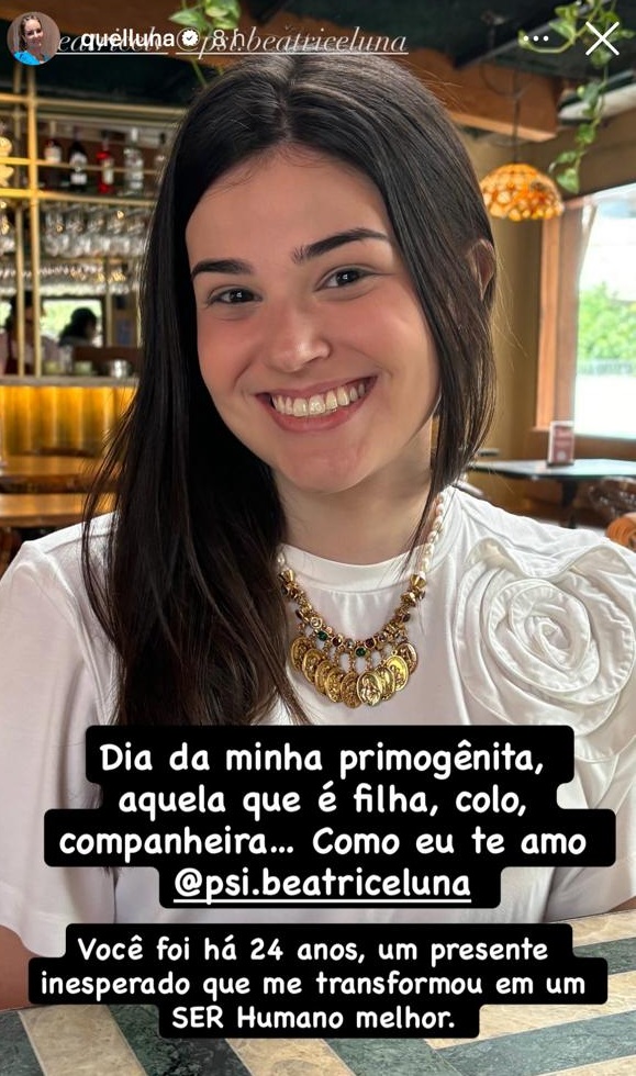 “Dia da minha primogênita, aquela que é filha, colo, companheira… Como eu te amo, Beatrice. Você foi, há 24 anos, um presente inesperado que me transformou em um ser humano melhor”.