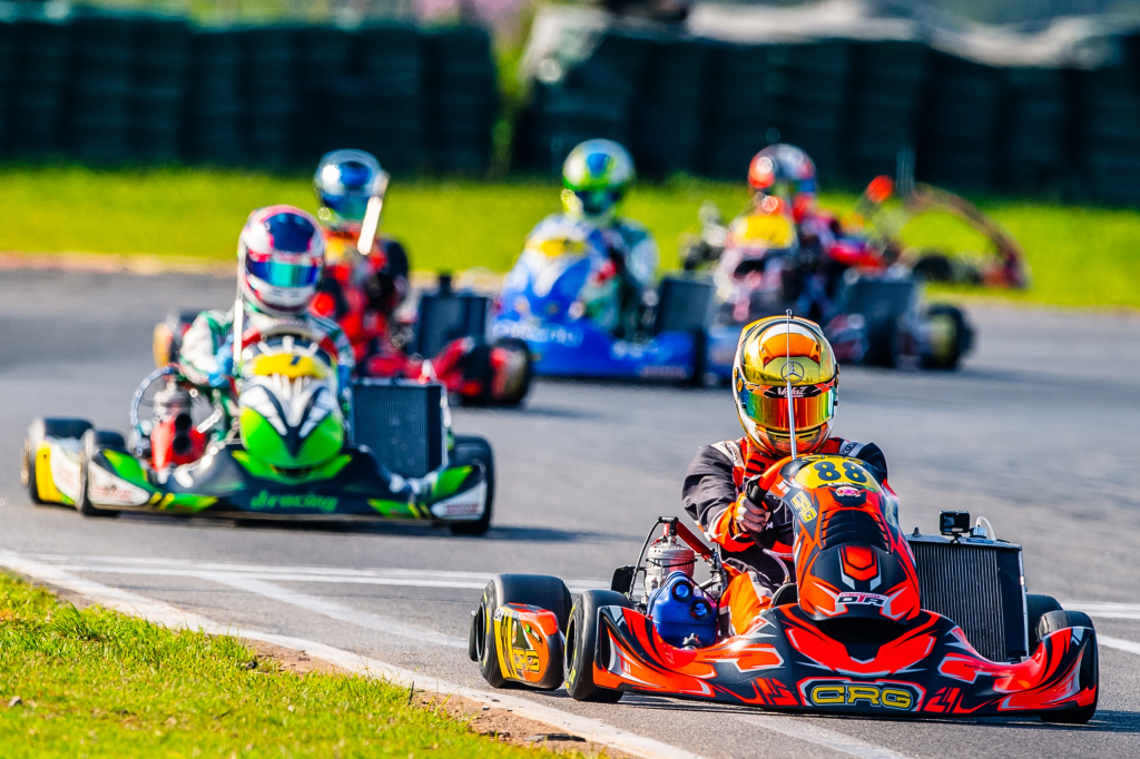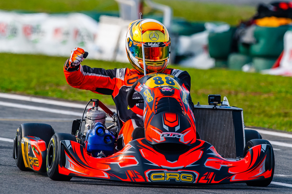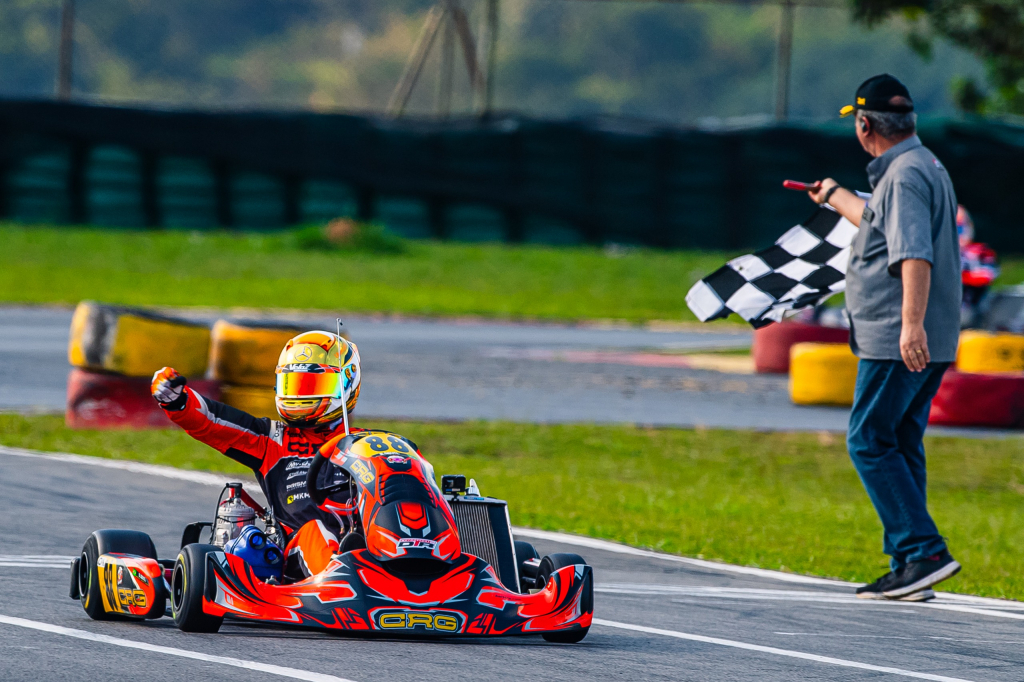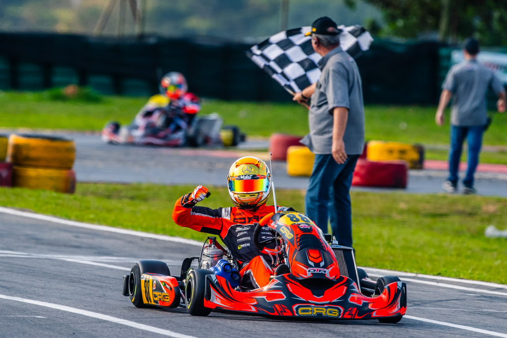 Representando a fabricante de chassis CRG e a equipe DTR Motorsport, Bernardo largou em terceiro e assumiu a ponta logo na primeira bateria, mantendo o ritmo firme até a bandeirada final. Na segunda corrida, partindo da quinta posição — por conta da inversão prevista em regulamento — cruzou em quarto e somou pontos suficientes para garantir o primeiro lugar da etapa. A comemoração veio com punho erguido e bandeira quadriculada ao fundo. Mais um capítulo promissor para o piloto cearense, que segue entre os nomes mais promissores da nova geração do kartismo nacional.