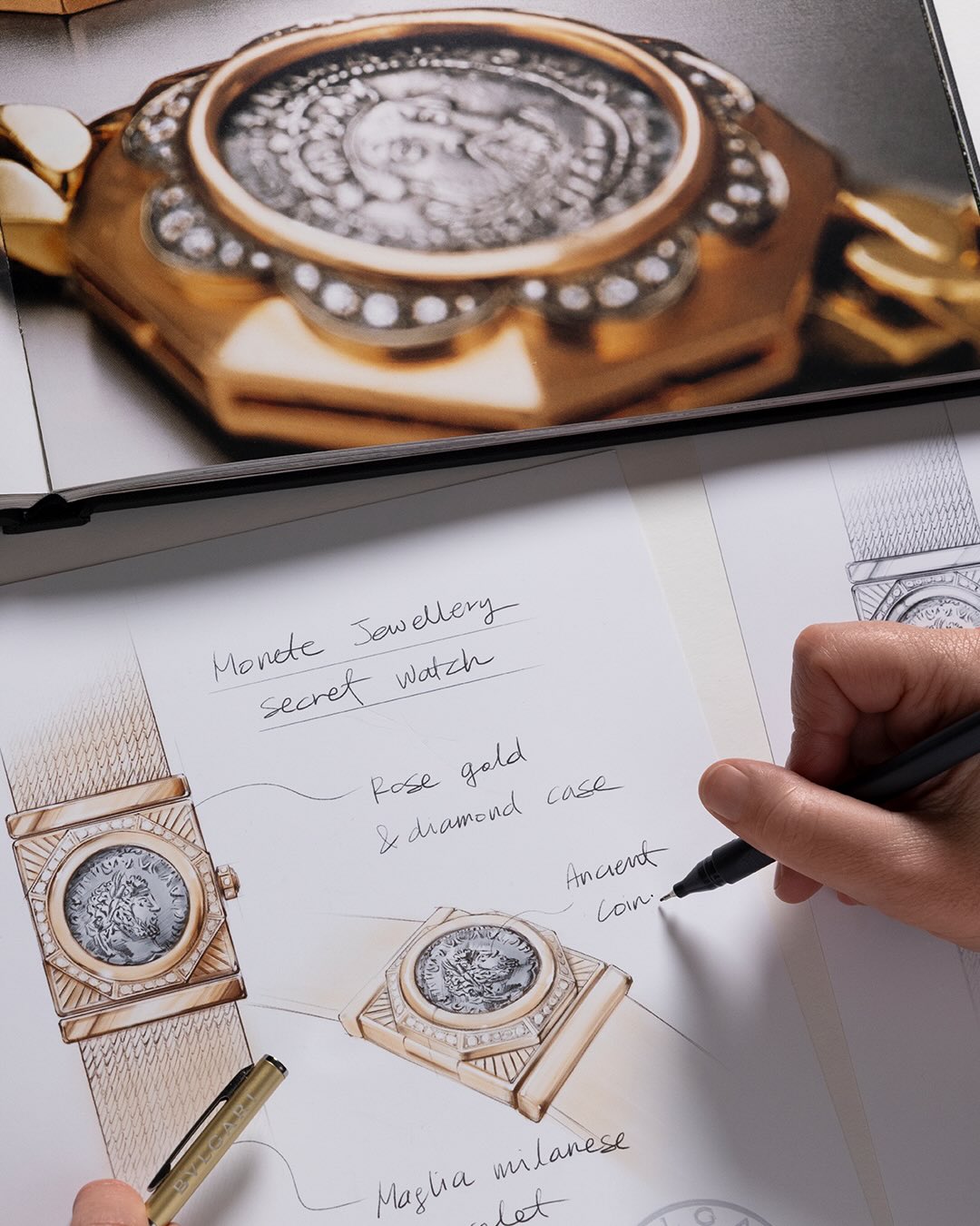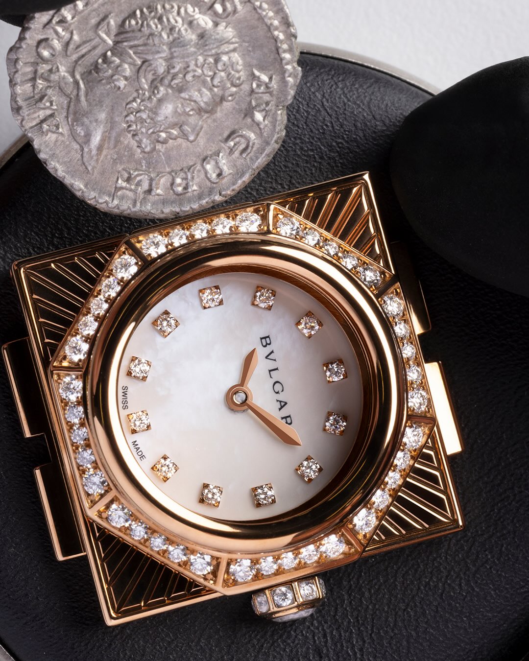 O Maglia Milanese Monete Secret Watch surge como tributo direto à Roma Eterna. No centro da criação, uma moeda autêntica de prata, datada entre 198 e 297 d.C., com a efígie do imperador Caracalla, esconde o mostrador em madrepérola branca, revelado apenas ao abrir a tampa. A caixa octogonal em ouro rosa, cercada por diamantes, é acompanhada por uma pulseira de malha milanesa, técnica renascentista reinterpretada com rigor contemporâneo. No interior, o micromovimento Piccolissimo BVP100, reconhecido como o menor do mundo em sua categoria, confirma a excelência mecânica da peça.