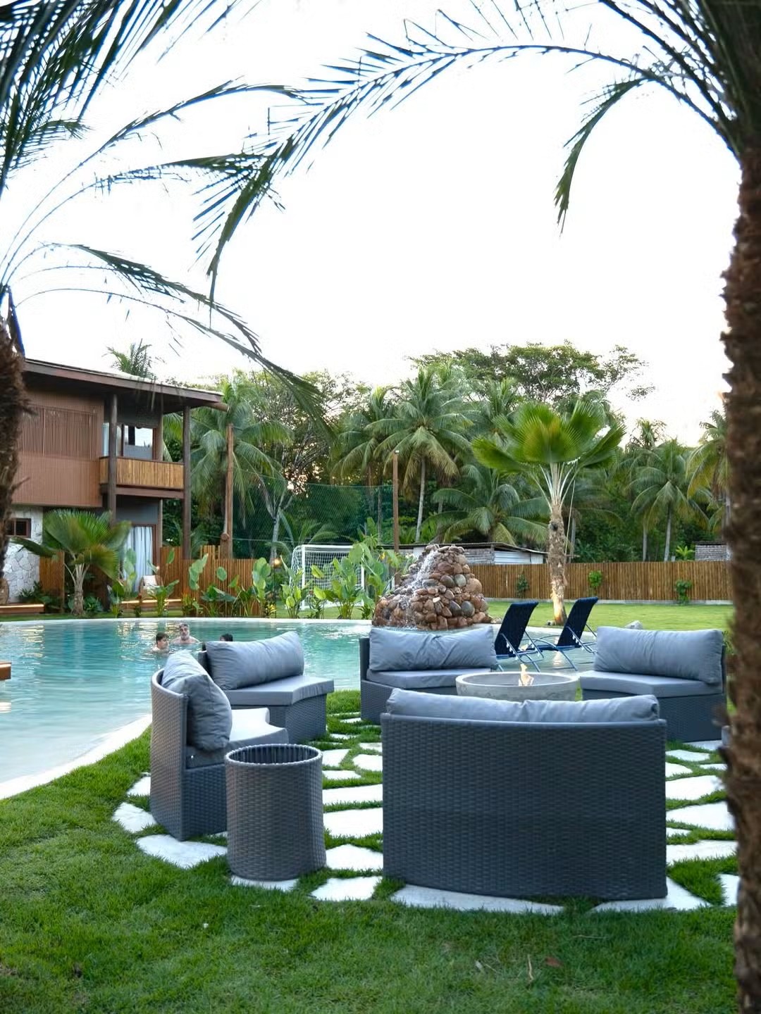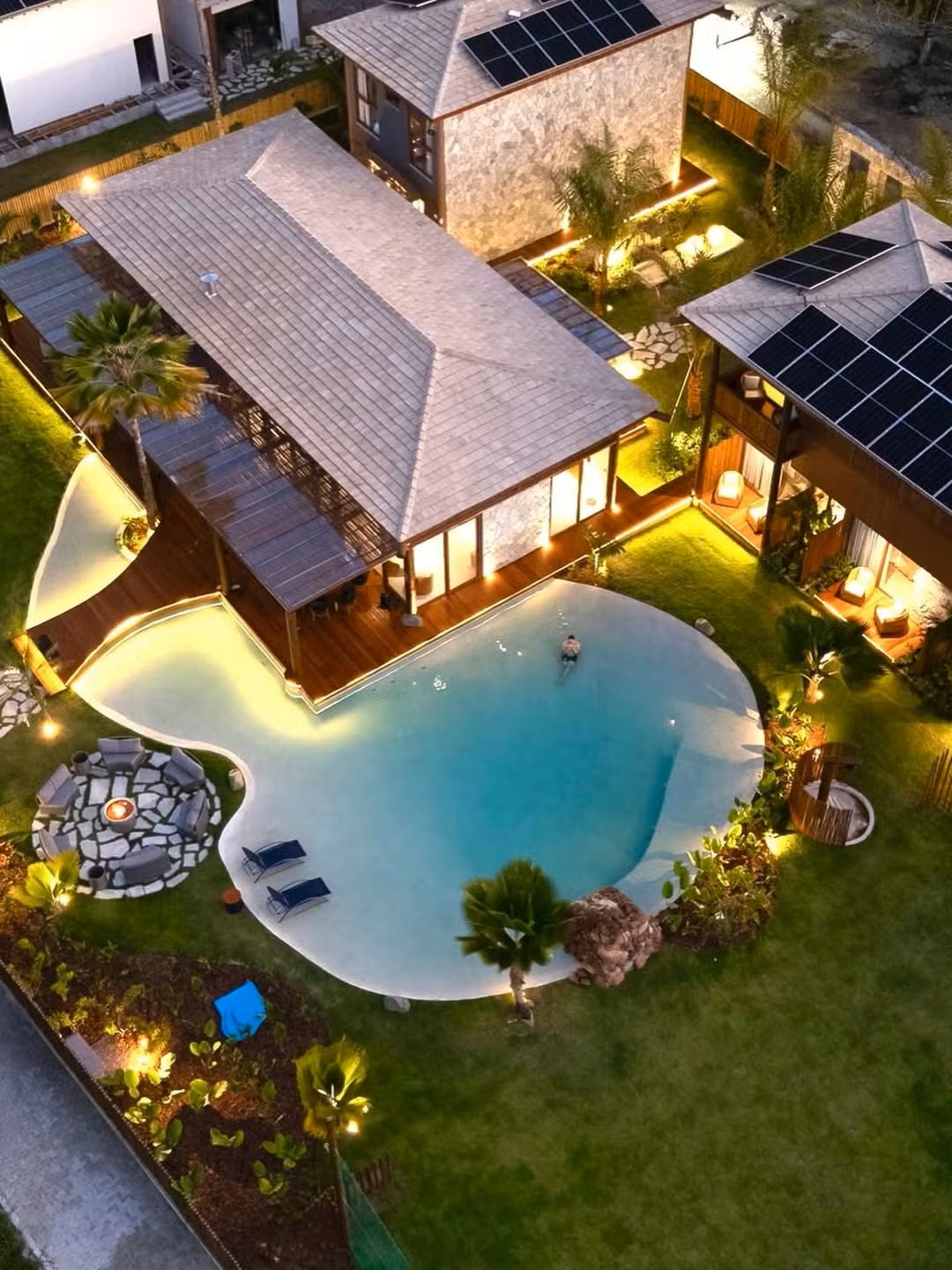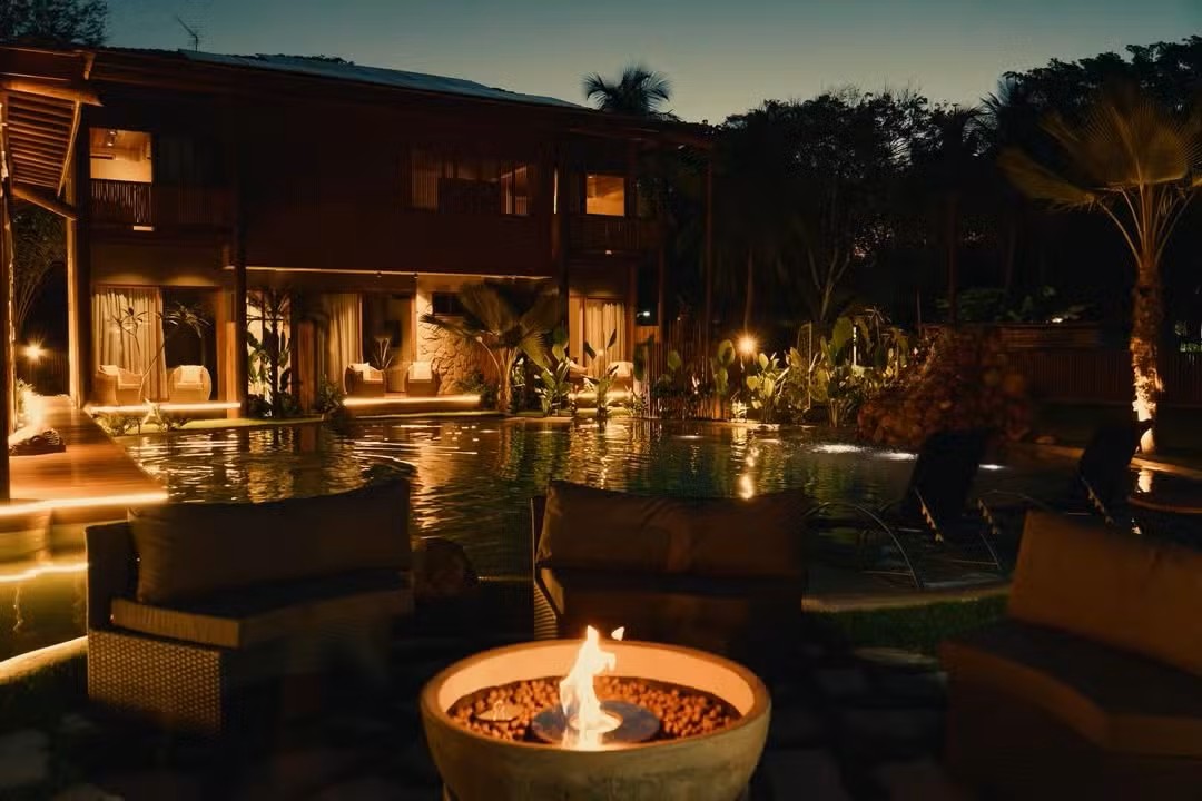 A área externa revela um dos pontos altos do empreendimento: piscina com iluminação cênica inspirada em uma prainha particular, jardim com paisagismo tropical, fire pit e amplos espaços de convivência ao ar livre — elementos que reforçam a proposta de imersão em natureza e bem-estar.