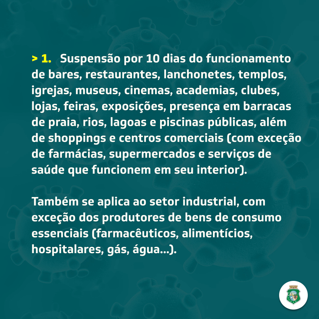 “Só vamos reduzir a contaminação ao reduzir o fluxo de gente nas ruas. E nesse momento o que está em jogo é a vida das pessoas. Sei que essas decisões tem repercussões econômicas, mas nesse momento a nossa prioridade é preservar vidas e resguardar os nossos irmãos e irmãs cearenses”, disse o governador.
