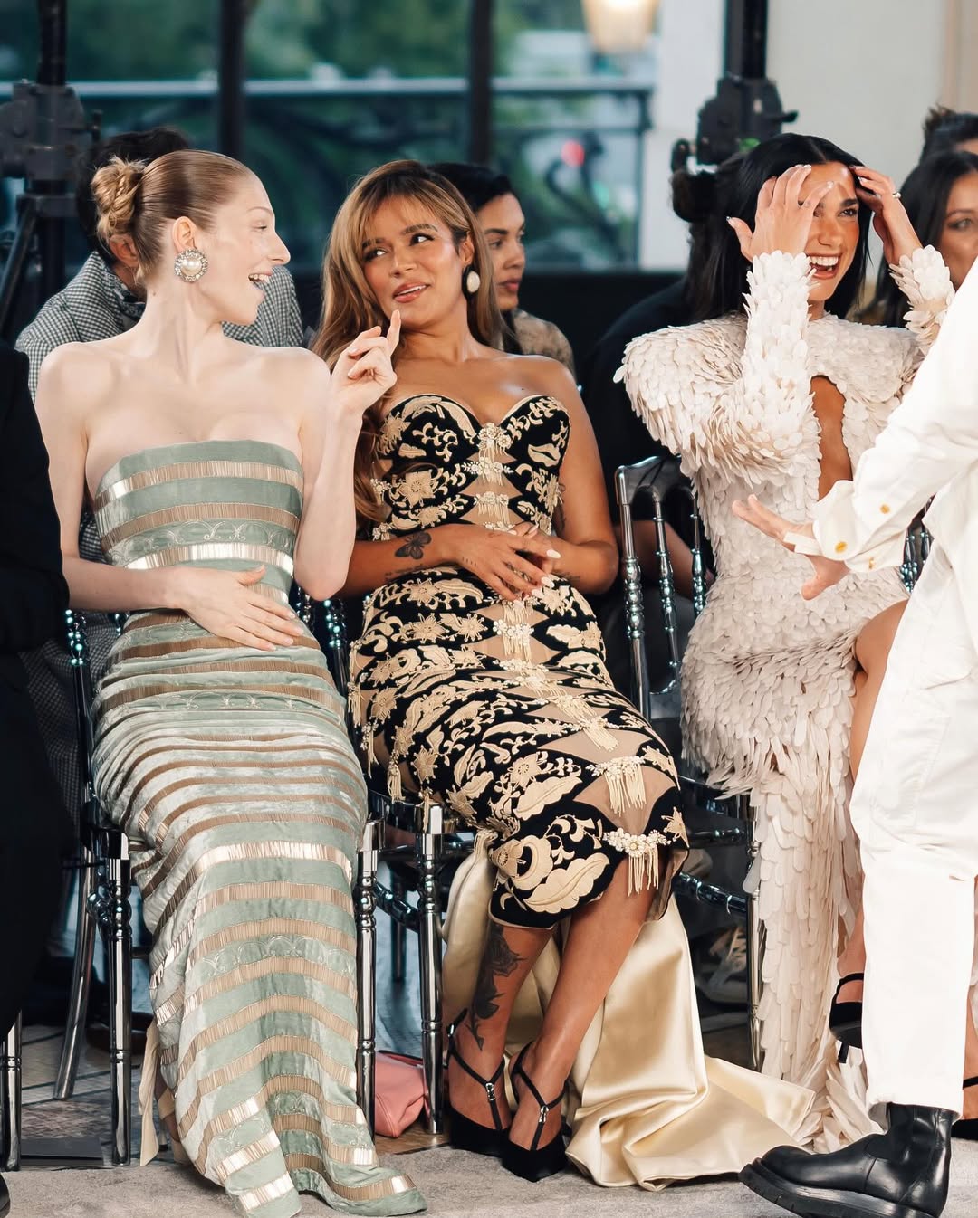 Do Brasil, Gkay reforçou sua afinidade com a Schiaparelli usando um vestido azul justo com trança integrada — mistura entre moda e escultura que traduz bem o espírito experimental da grife. Já Philippine Leroy-Beaulieu, estrela da série Emily in Paris, escolheu um vestido marrom sóbrio, imprimindo elegância discreta.