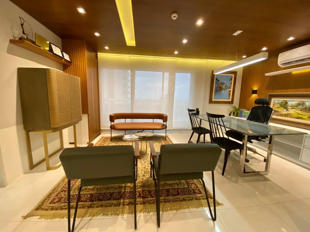 “O uso desse mobiliário de extremo bom gosto, aliado com peças tradicionais do acervo pessoal do cliente, como o tapete persa e quadros, tornaram o ambiente ainda mais sofisticado e com bastante personalidade, criando um espaço de trabalho agradável e pronto para receber os clientes”, explica a arquiteta.