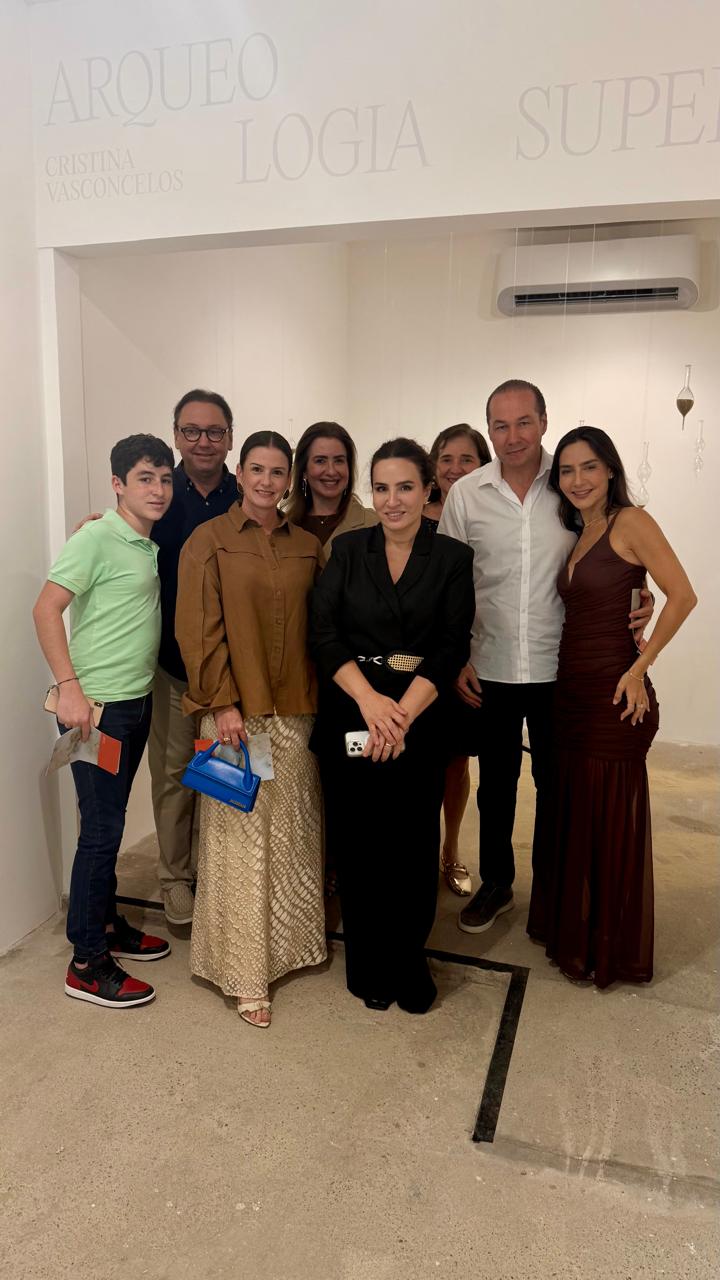 Cristina Vasconcelos com familiares do Comandante Ariston Pessoa durante a vernissage da exposição “Arqueologia da Superfície”, na galeria CAVE, em Fortaleza