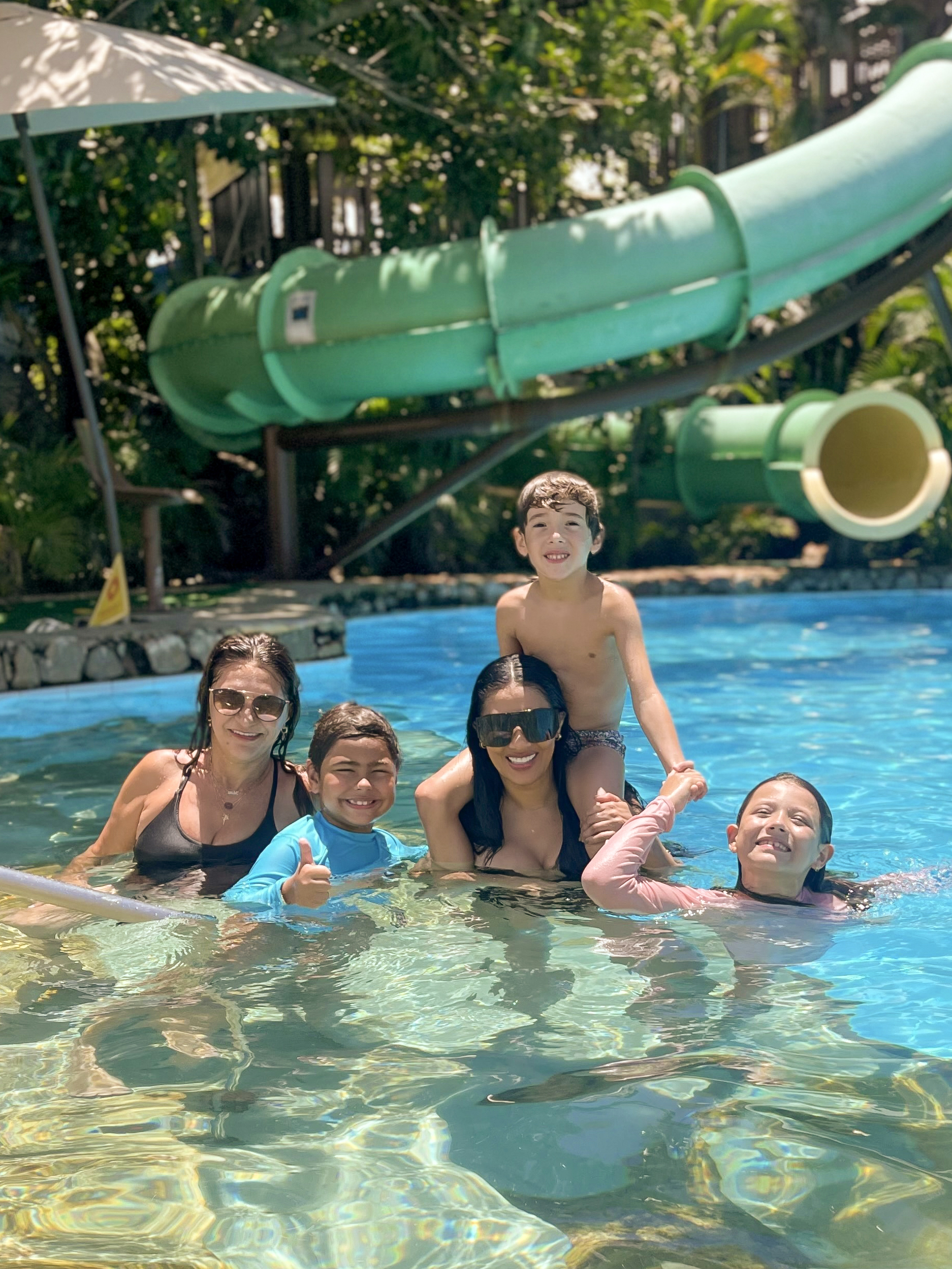 Por lá, a turma se divertiu no parque aquático e aproveitou para conhecer a nova atração, o Tobomusik, primeiro toboágua da América Latina a unir música e efeitos visuais, feito em parceria com o DJ e produtor musical Alok.