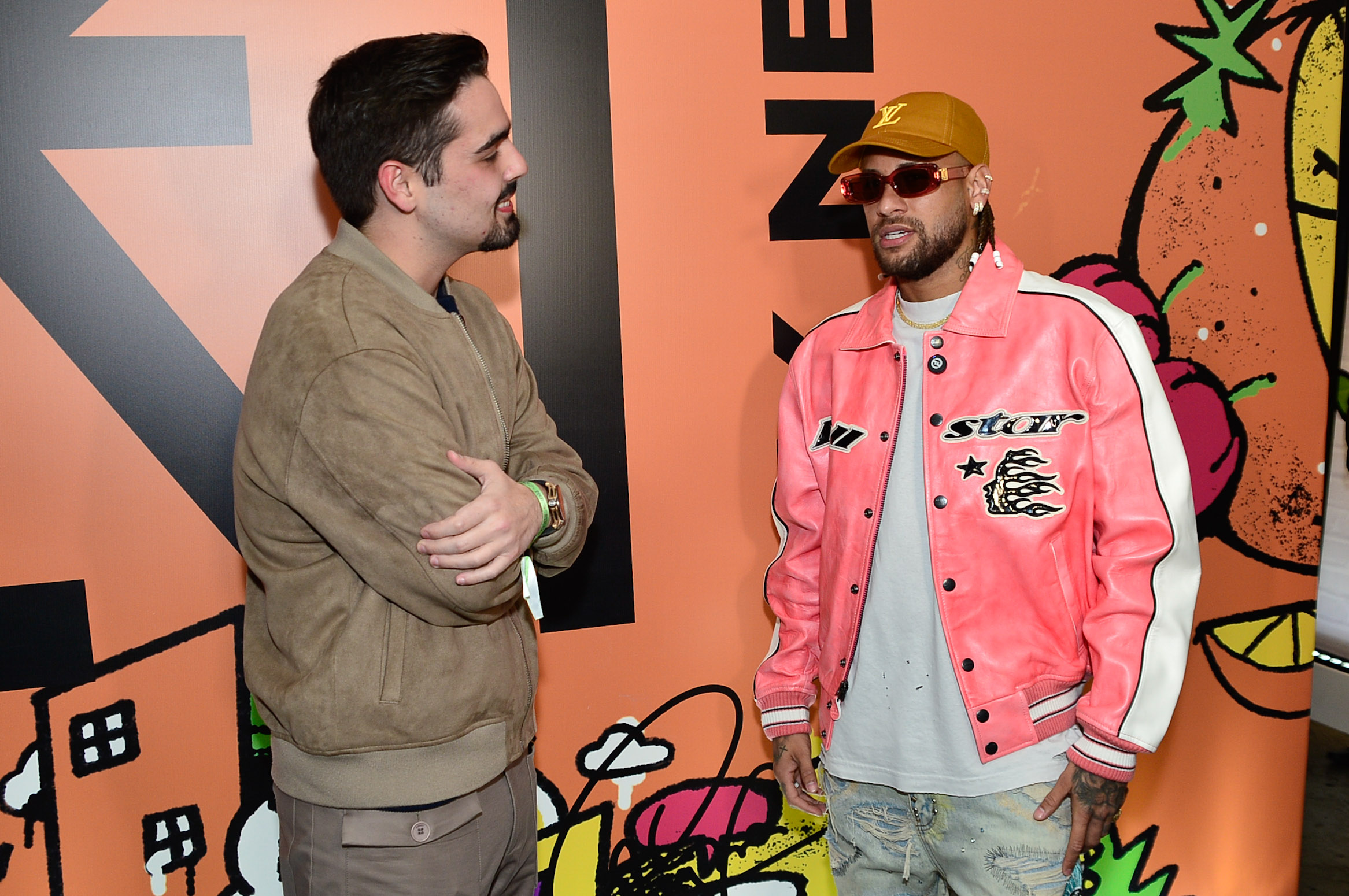 Neymar apareceu com um visual que traduz bem seu estilo. Usou uma jaqueta rosa de couro, avaliada em mais de R$ 17 mil, pertencente a uma coleção especial em comemoração aos 50 anos da Avirex, feita em colaboração com a Hellstar. De edição limitada, a peça une referências militares a elementos do streetwear atual. O jogador completou o look com um boné da Louis Vuitton e um jeans nada básico. Já Bruna Biancardi, grávida da filha caçula do casal, apostou em um composição confortável e elegante. A produção ganhou um toque final com jaqueta de couro e destacou o barrigão com muito estilo.
