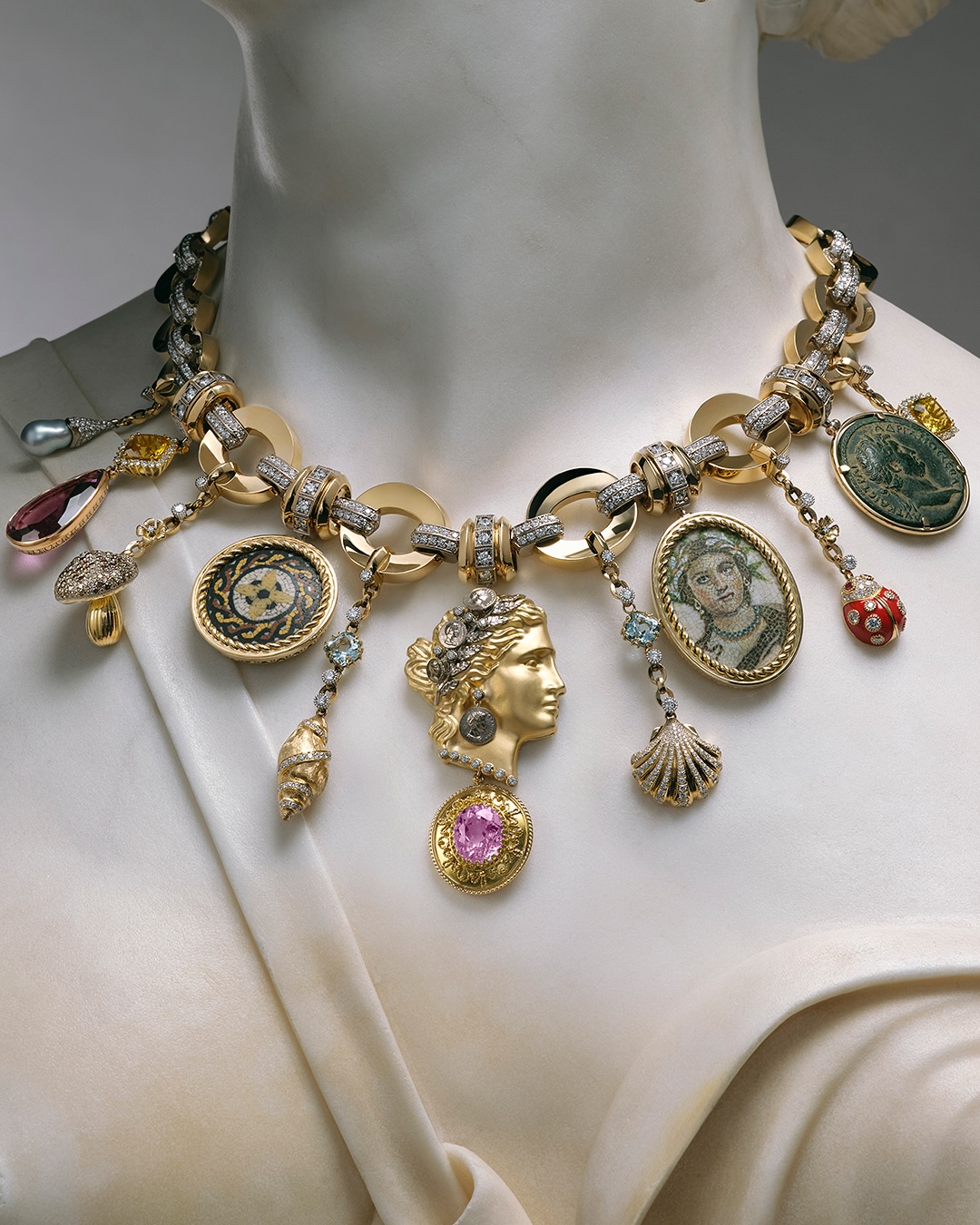Entre os destaques, colares que ganham contornos monumentais: uma joia central traz uma moeda autêntica do imperador Adriano (datada entre 119 e 122 d.C.) envolta por mais de 170 quilates de peridotos. Bustos moldados em pó de mármore, águas-marinhas lapidadas, esmeraldas colombianas e safiras compõem a estética barroca que dialoga com a opulência da Dolce Vita. Ícones sacros como querubins e corações sagrados também surgem em interpretações refinadas, ao lado de relógios Mirage, inteiramente cravejados com gemas. Um tributo exuberante à Roma eterna e sua simbologia atemporal.