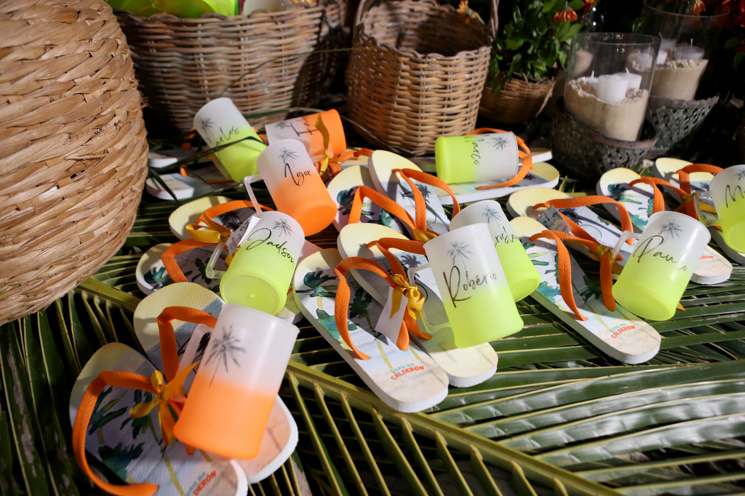 As lembrancinhas, pensadas com carinho pela “lembrancê” trouxeram um ar colorido e muito neon nos chinelos, necessaire, taças e saídas de praia personalizadas com o nome de todas as amigas presentes na festa.