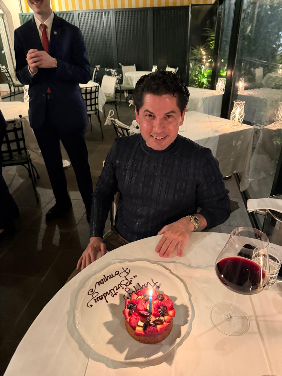 A noite no DaV Mare, restaurante do Splendido Mare, ganhou movimento fora do roteiro. Durante o jantar intimista, a equipe surgiu reunida em torno da mesa, conduzindo um coro de “tanti auguri” e apresentando bolo assinado, criado especialmente para a ocasião.