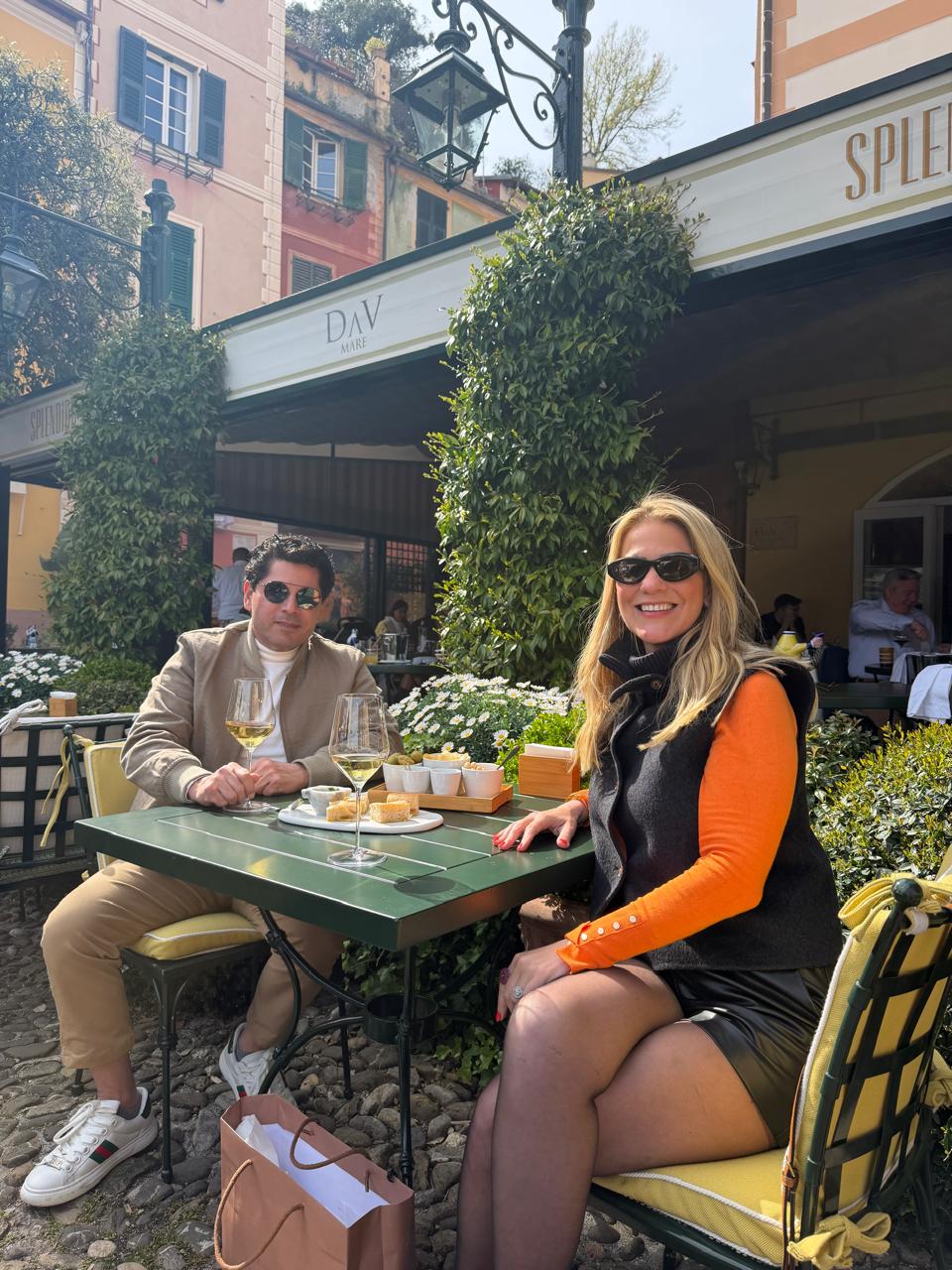 Pompeu Vasconcelos e Mariana da Fonte no DaV Mare, no coração da Piazzetta de Portofino – Fotos: Arquivo Pessoal
