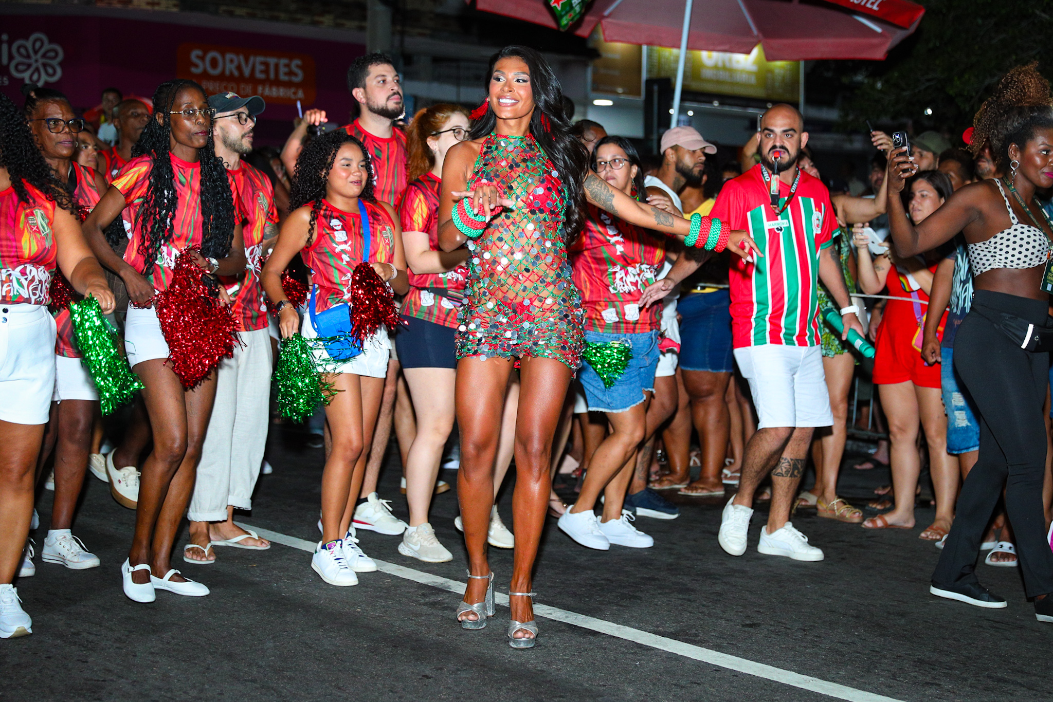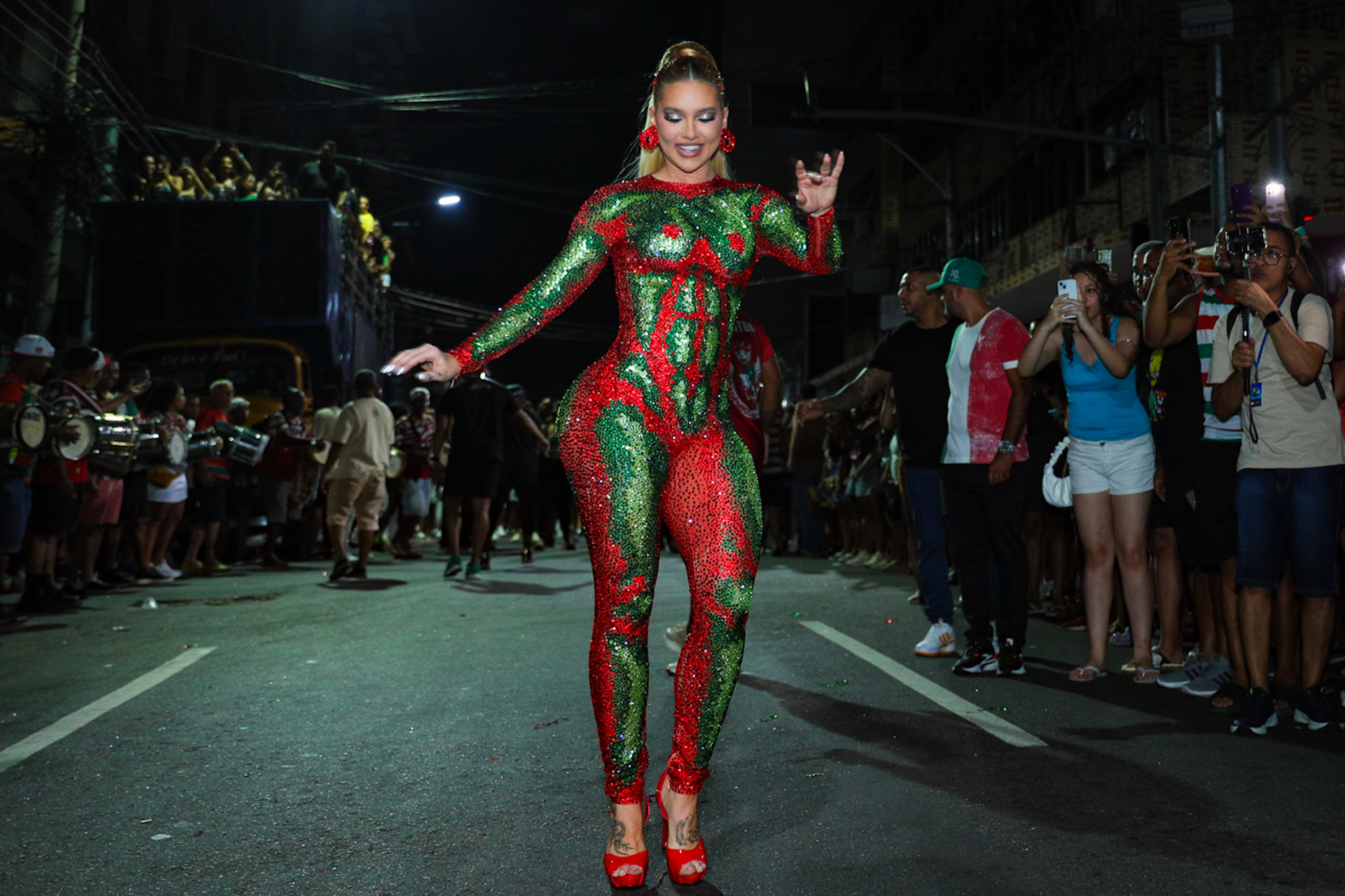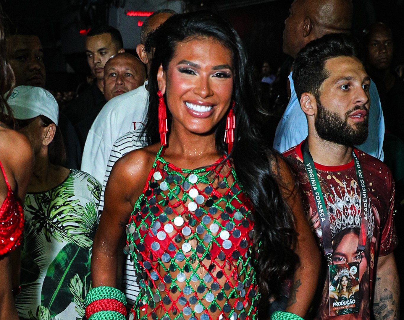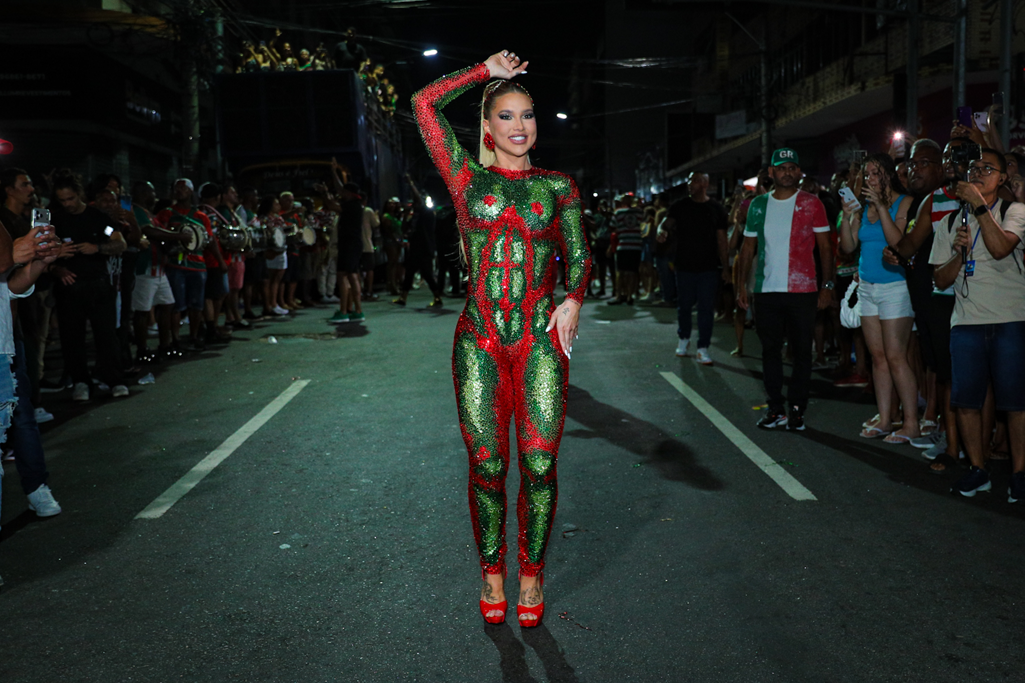 A rainha de bateria escolheu um macacão cravejado de pedrarias verdes e vermelhas, alinhado às cores da escola, que transformou cada movimento em ponto de atenção do público. Entre fotos, cumprimentos e passos firmes de samba, Virginia acompanhou de perto o trabalho dos segmentos, reforçando sua integração com a comunidade e com o ritmo da bateria.