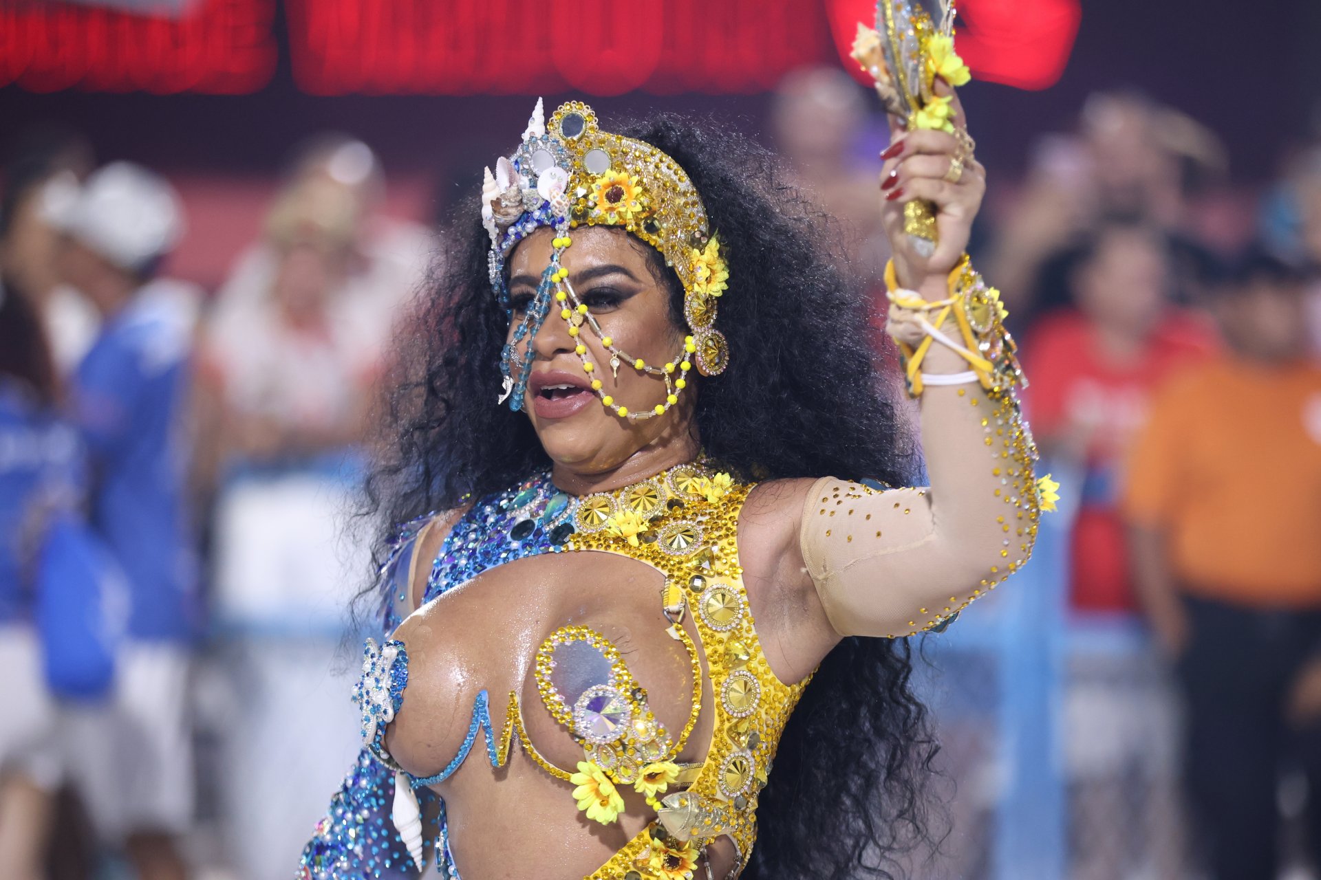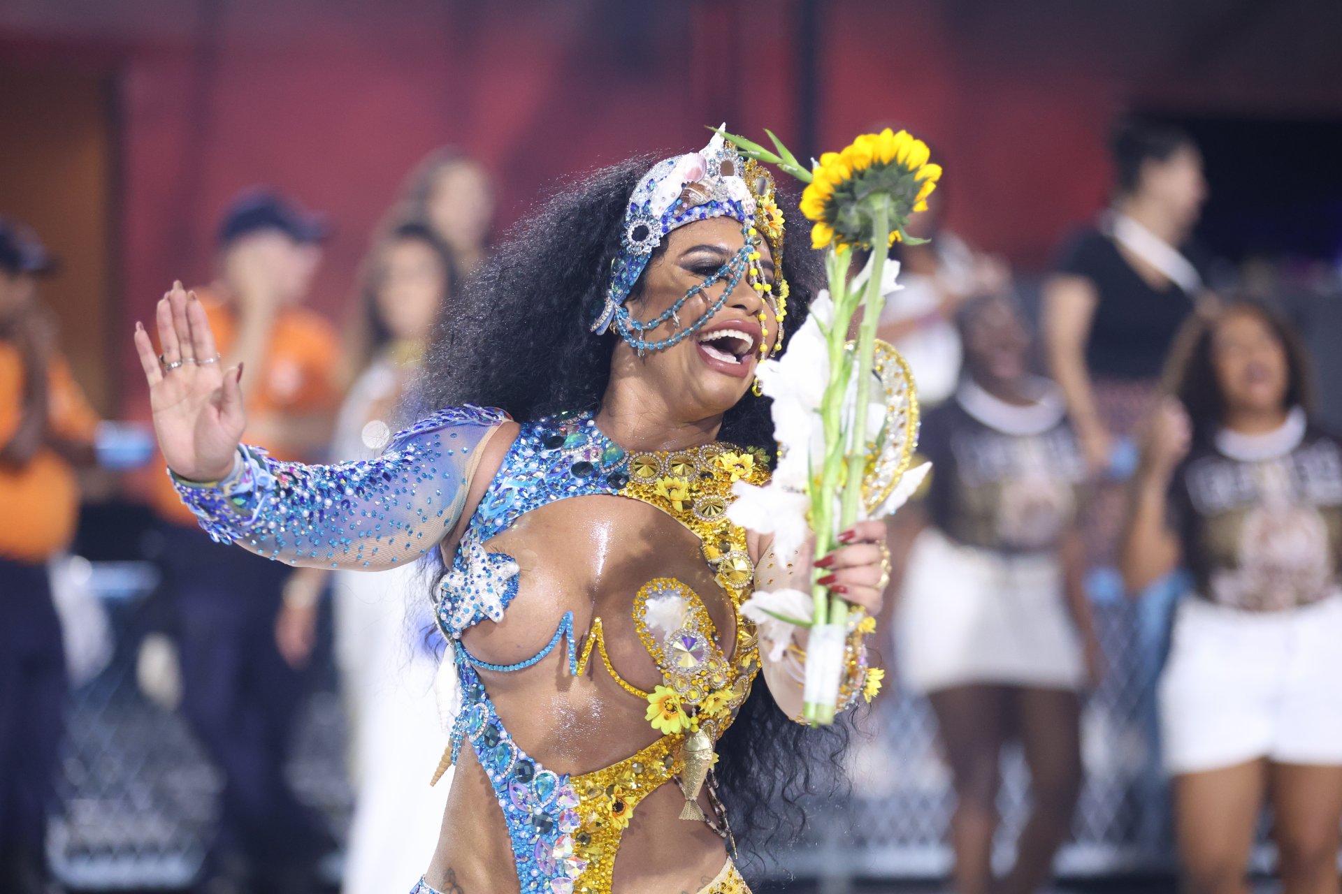 Recém-saída da novela Dona de Mim, Giovanna será destaque no carro abre-alas da azul e branco no desfile oficial. Para o ensaio, a atriz escolheu um look azul, com saia e top telados e acessórios com pérolas, em sintonia com as cores da escola.