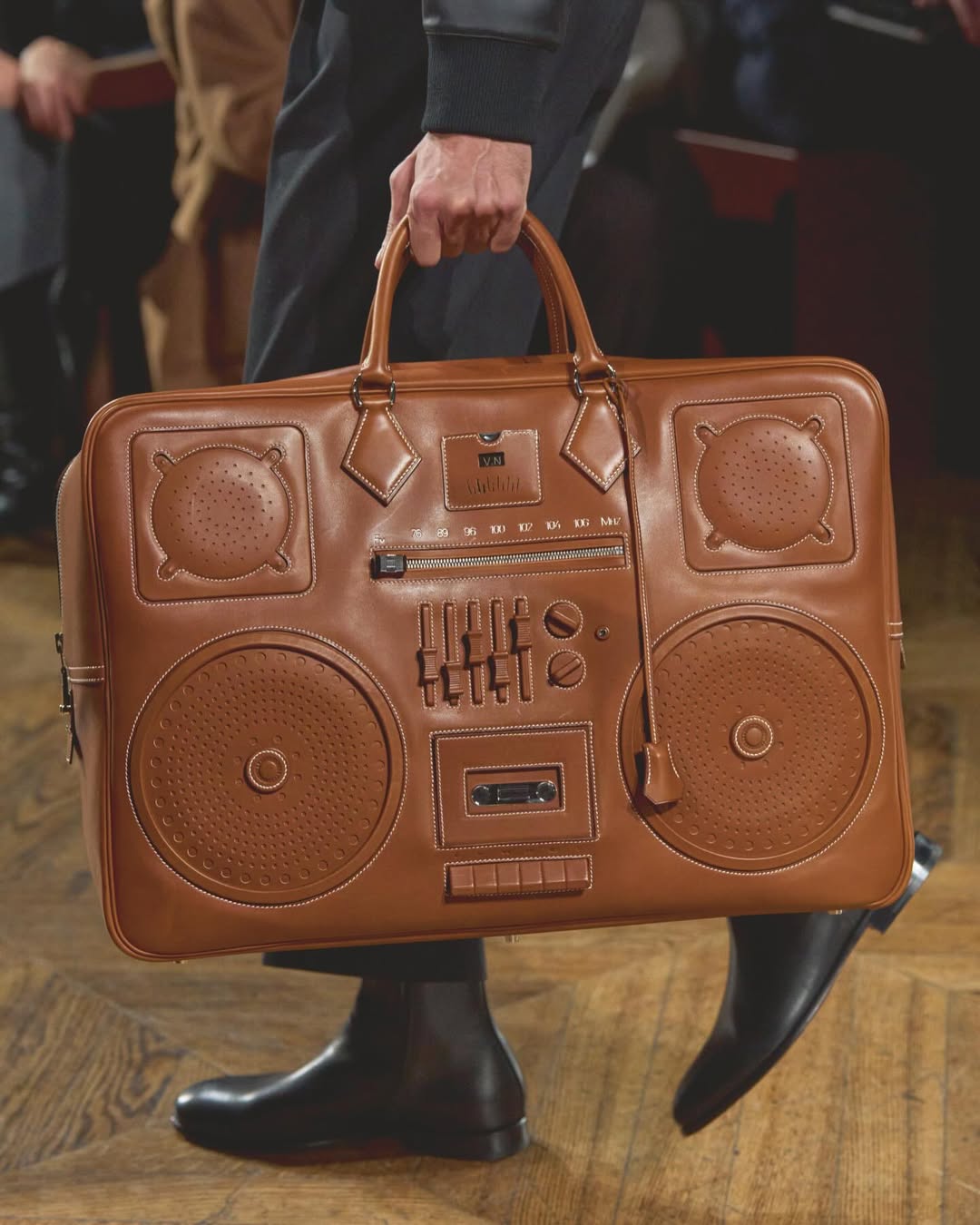 Produzida em couro marrom caramelo, com opção também em preto, a bolsa reflete uma tendência consistente da moda de resgatar referências sonoras vintage e reinterpretá-las sob uma ótica sofisticada. O acessório dialoga com movimentos recentes, como o listening room de estética retrô inaugurado pela Valentino em Nova York, o convite em formato de fita cassete da Balenciaga e o vídeo de lançamento da nova linha de skincare de Dua Lipa, que se inicia com o gesto de apertar o play de um walkman. Na mesma temporada, a Louis Vuitton também apresentou sua leitura do tema, com uma mala inspirada em soundsystem de acabamento metálico.