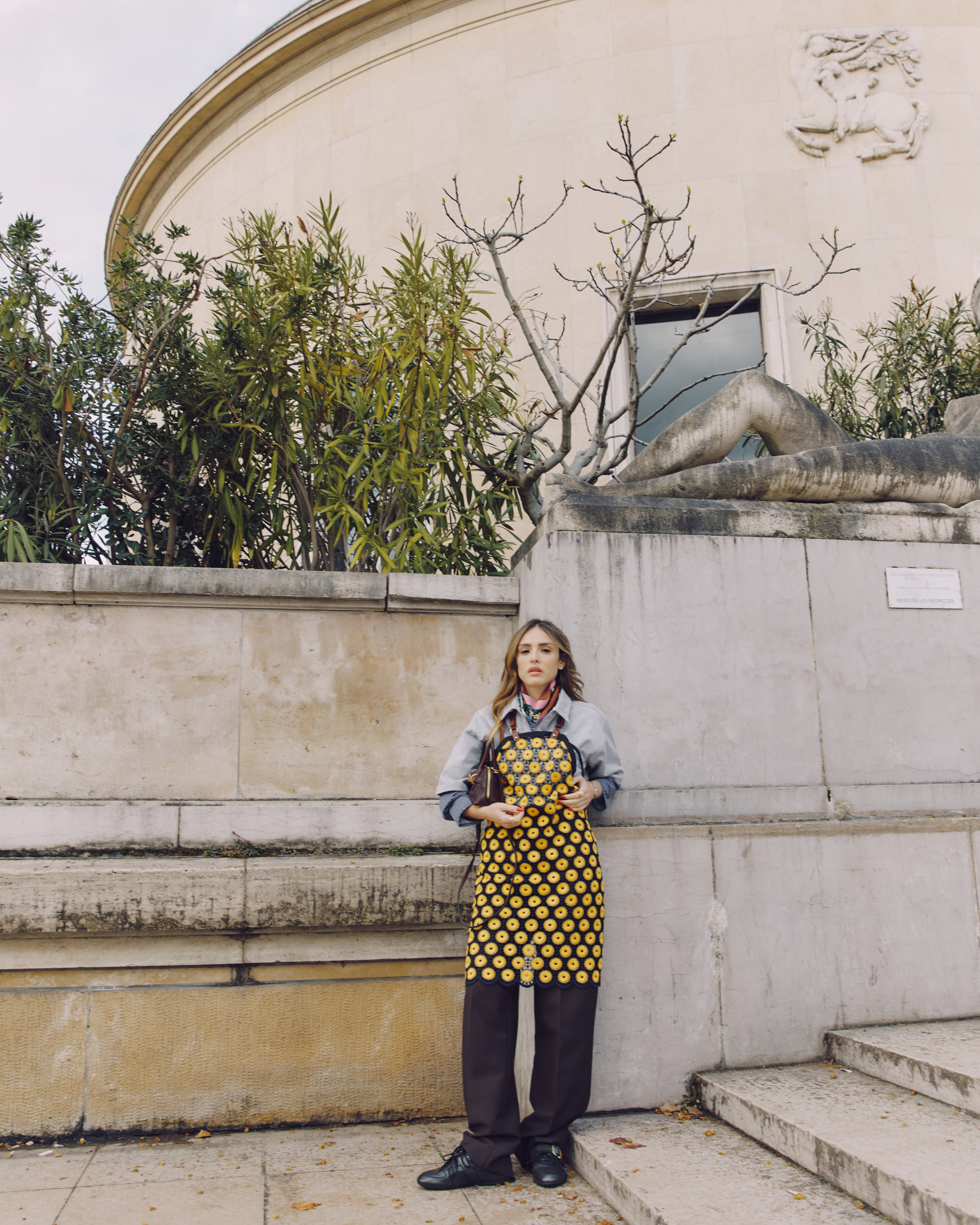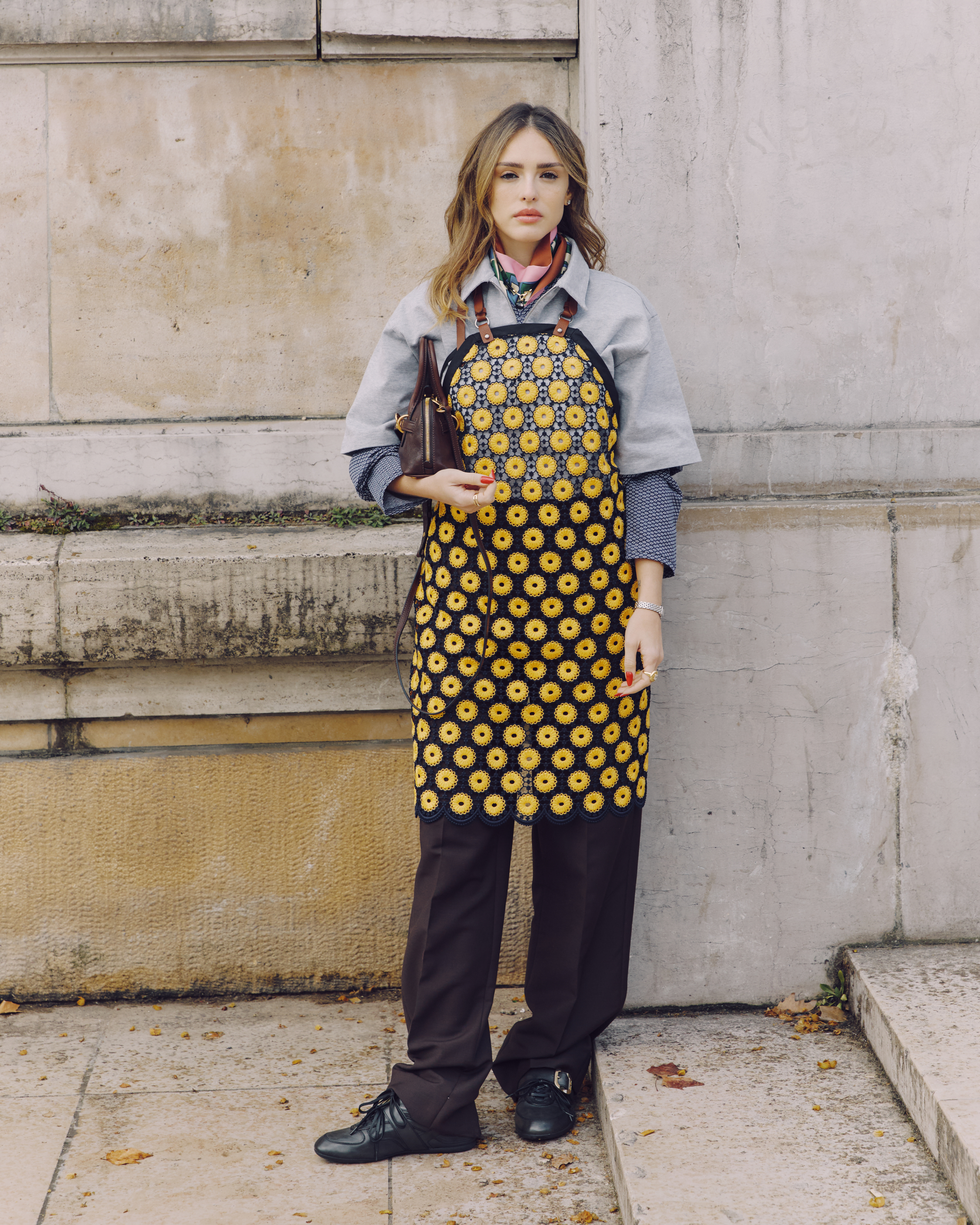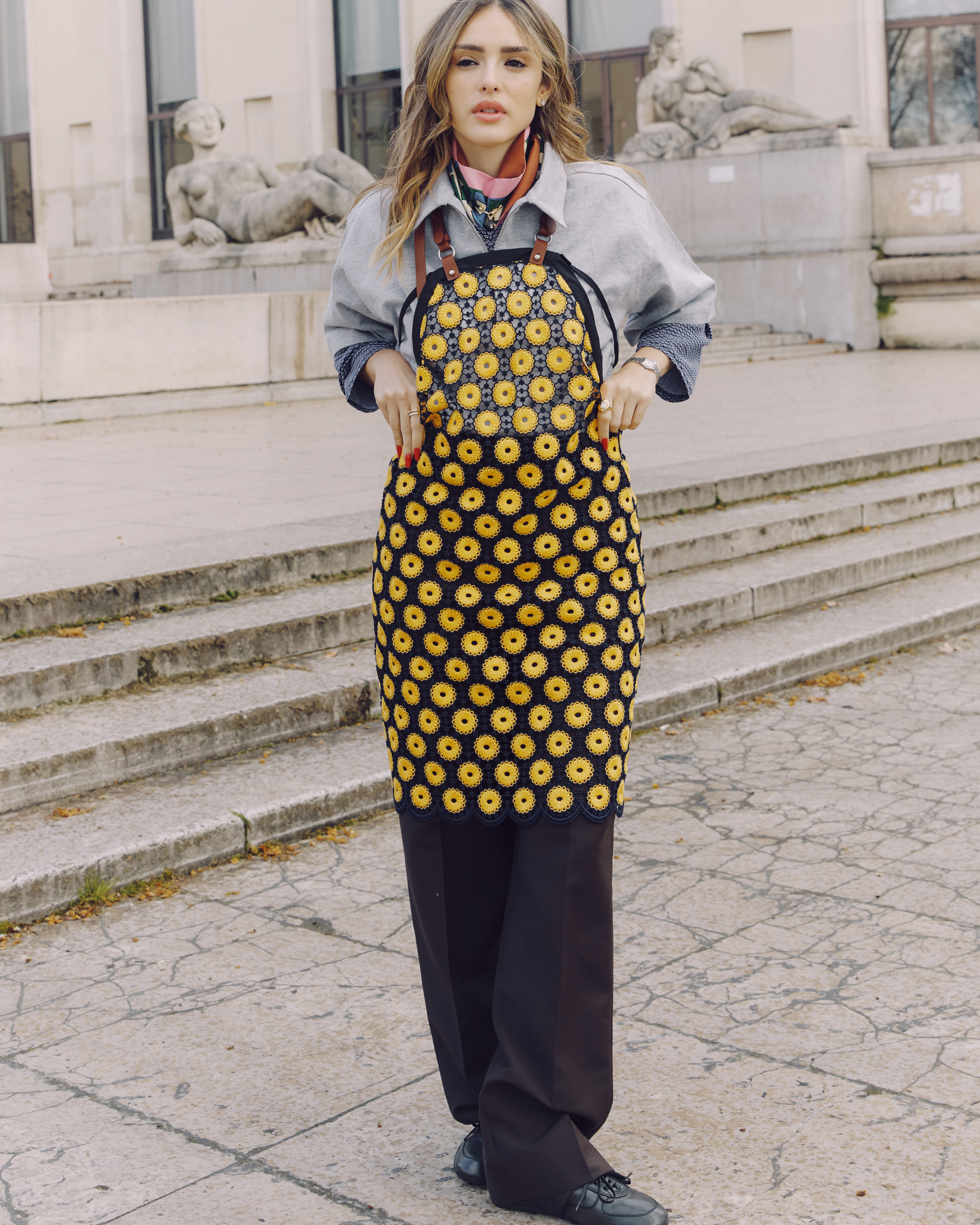 Para acompanhar o desfile, Isabelle apostou em um visual alinhado à proposta da marca. A atriz surgiu com camisa em tom neutro, combinada com calça de alfaiataria e sapatos pretos. O destaque ficou para a sobreposição em estilo avental floral, com estampa amarela sobre fundo escuro, referência direta ao conceito apresentado na coleção.
