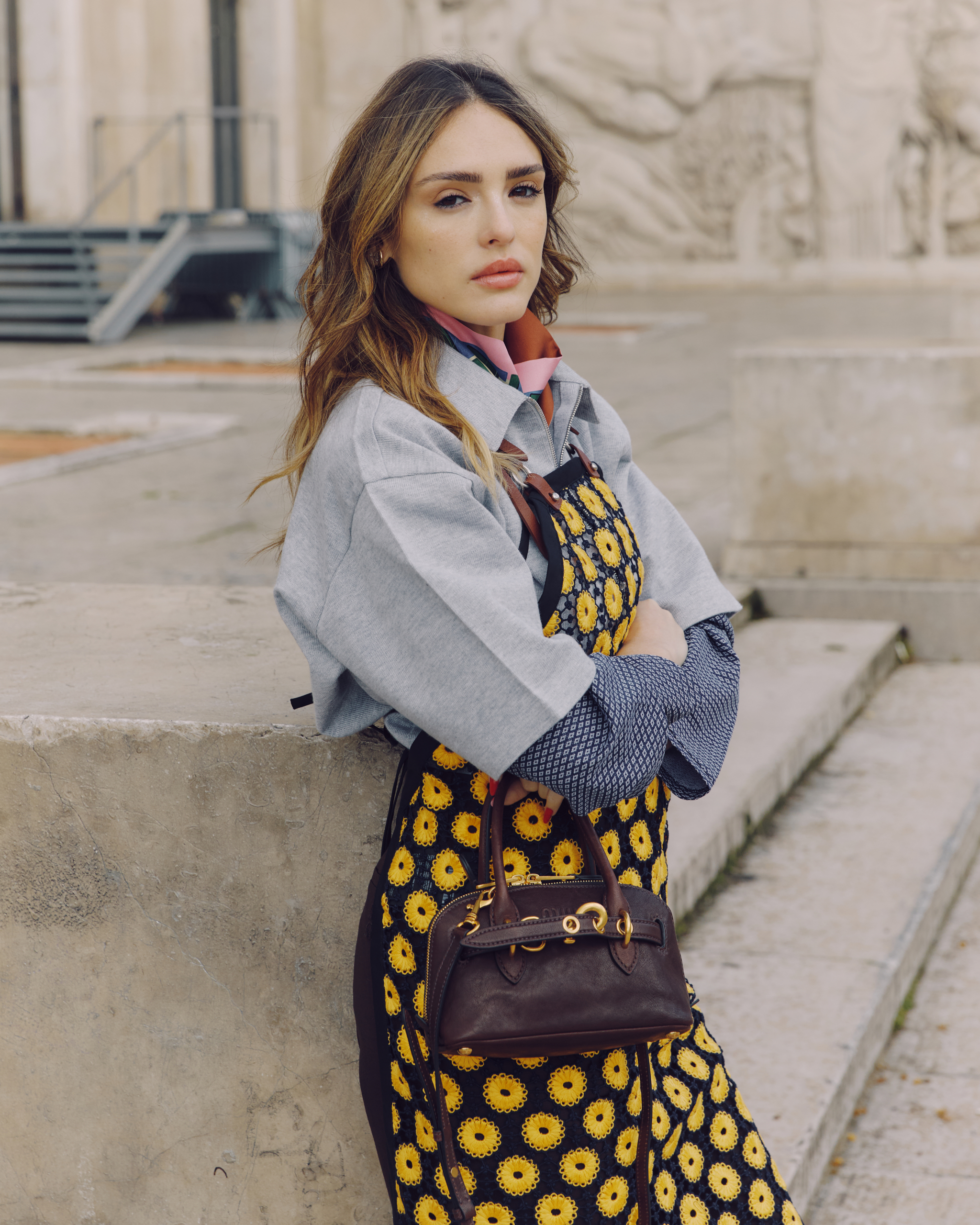 O look foi finalizado com lenço no pescoço e acessórios discretos, reforçando o equilíbrio entre o lado prático e o toque cool que marca a estética da grife italiana. O desfile também reuniu nomes como Bárbara Palvin, Nina Dobrev, Daisy Edgar-Jones, Joey King e Ella Gross entre os convidados.