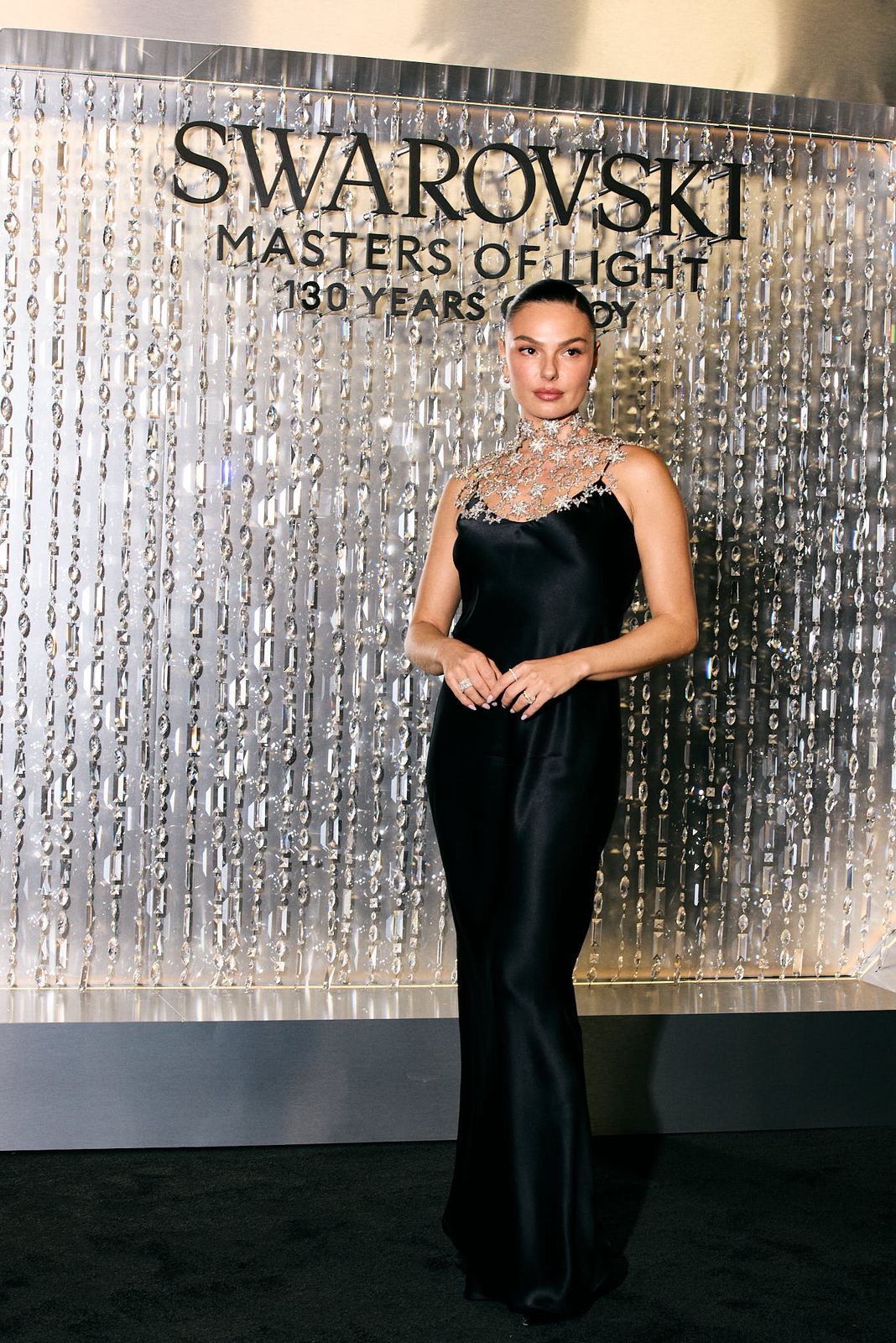 A brasileira chamou atenção com um vestido de seda preta de silhueta fluida, pontuado por recortes sutis que evidenciaram a estética minimalista e refinada da marca. Para completar o look, Isis escolheu acessórios inéditos da Swarovski, incluindo uma joia icônica anteriormente usada por Madonna, composta por mais de doze mil cristais e resultado de 86 horas de trabalho artesanal.