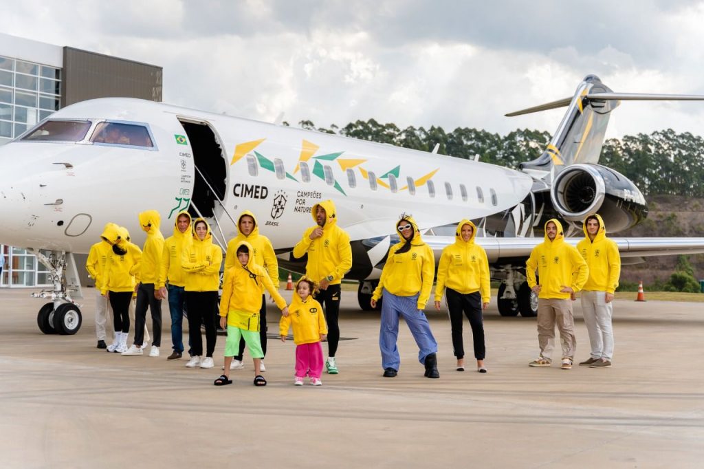 Entrando no clima, a turma embarcou com um moletom personalizado, na cor da marca da Cimed com o canarinho da Copa, em uma collab da companhia com a marca Overcome.