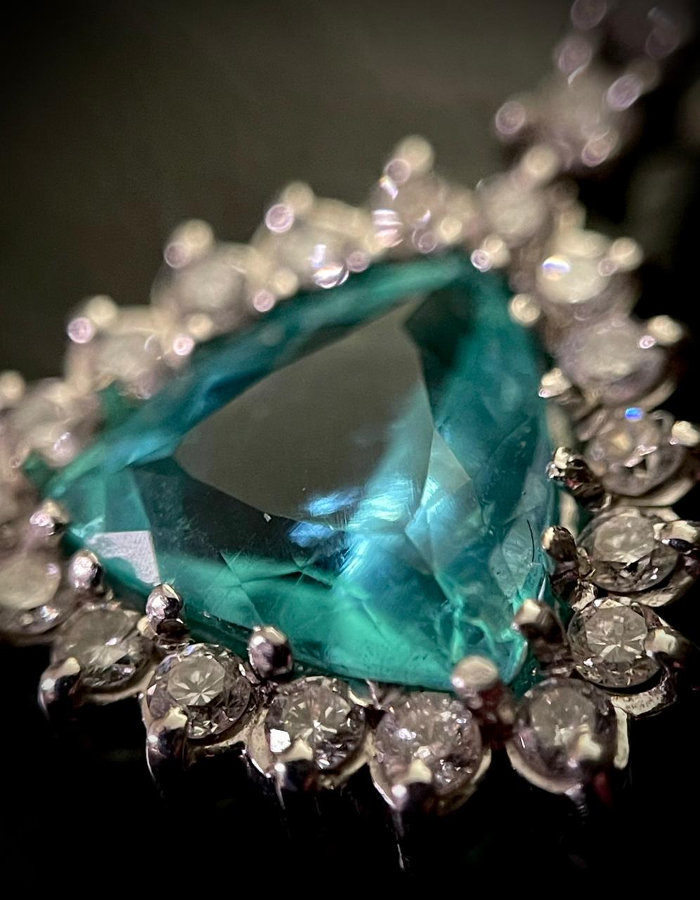 Entre os destaques, sobressai um pingente com Turmalina Paraíba certificado pelo Gemological Institute of America (GIA), reconhecido mundialmente pela raridade e intensidade cromática das gemas analisadas. Outro ponto de relevância é um conjunto histórico composto por broche e brincos em mosaico florentino, oriundo da tradicional Joalheria Torrini, criada por Giocondo Torrini.