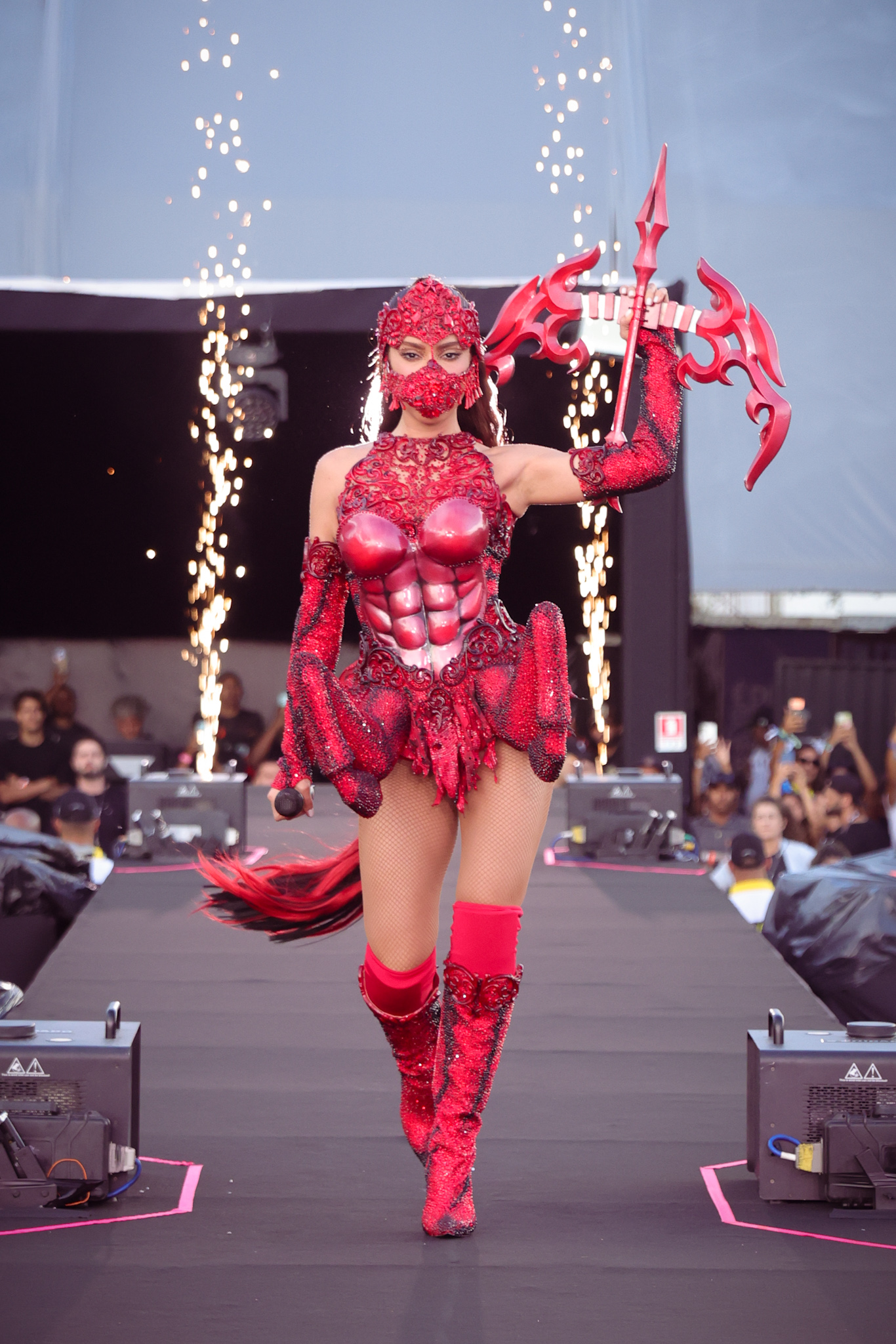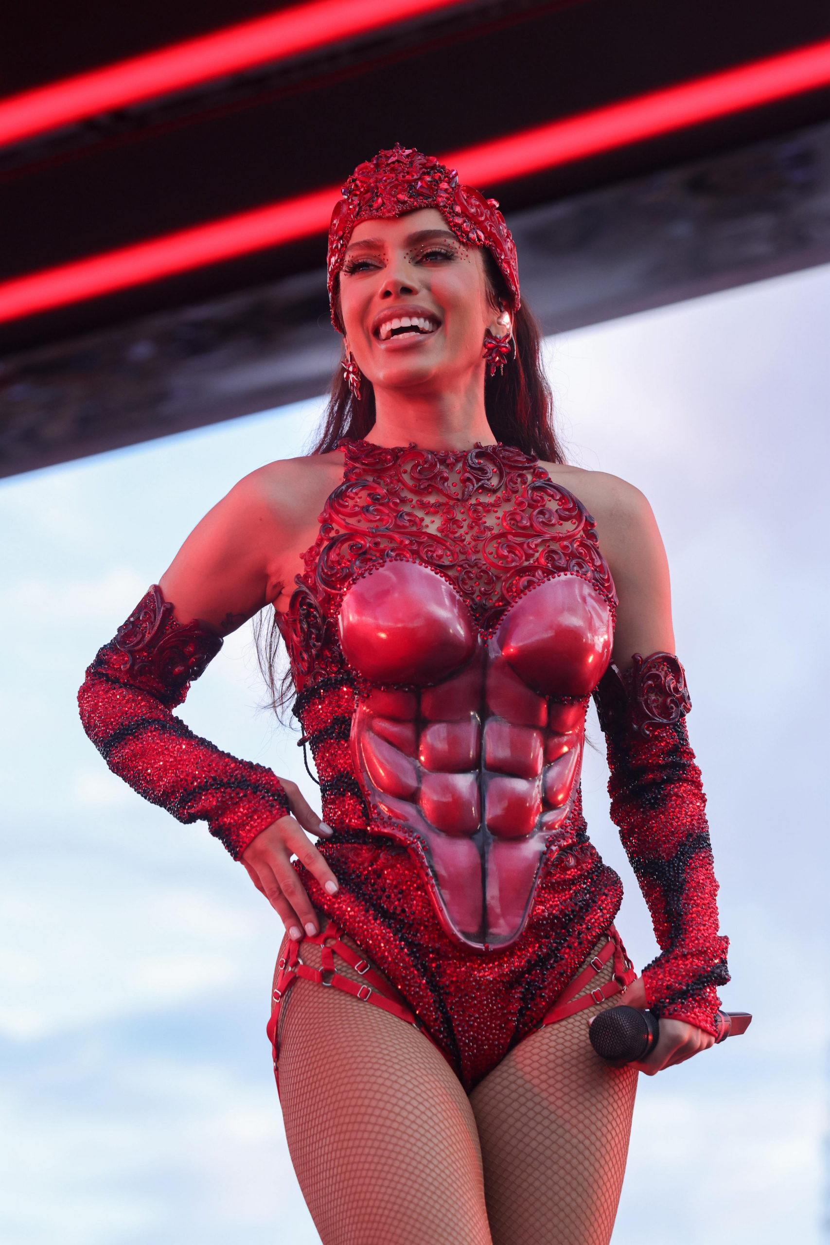 No domingo (18), em Brasília, Anitta celebrou Sagitário, look marcado por vermelho, brilho, máscara e referências mitológicas. O figurino incluía arco e flecha e patas de cavalo, em alusão ao centauro arqueiro, símbolo do signo. A apresentação manteve a atmosfera carnavalesca que norteia todo o projeto, combinando fantasia e elementos de espetáculo.