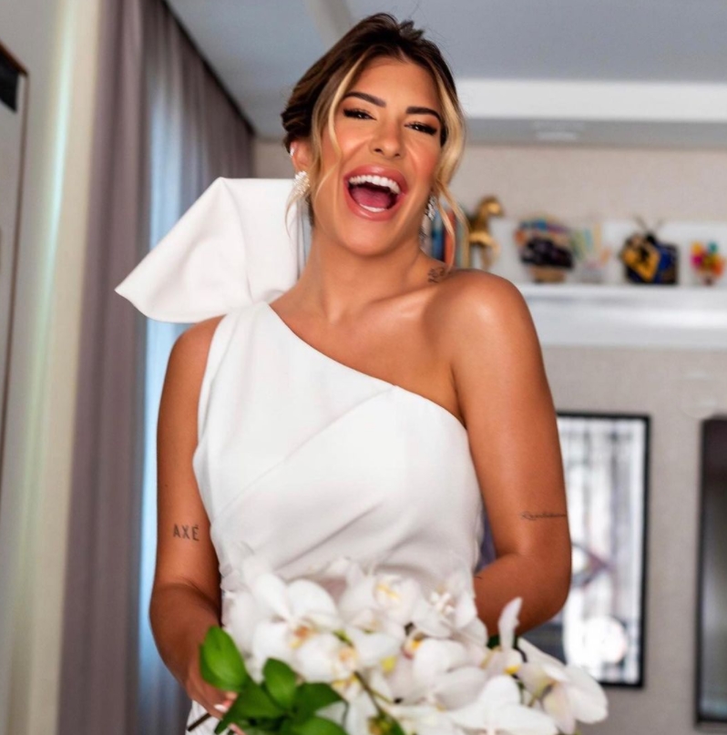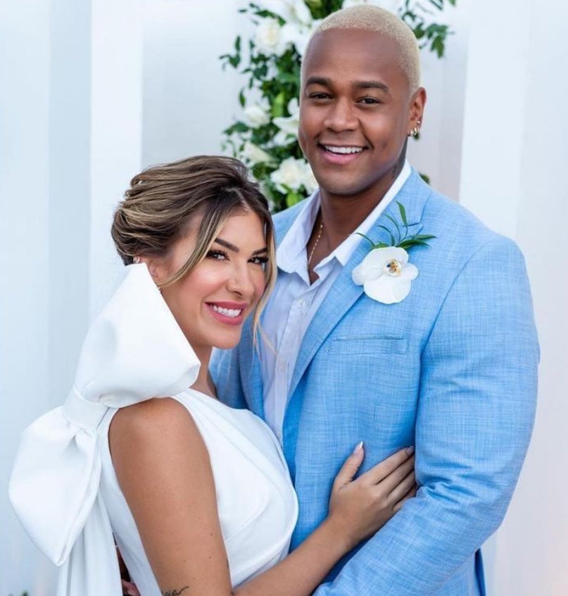 Para o grande dia, enquanto Léo Santana escolheu um terno azul claro, a noiva optou por um vestido simples e marcante, assinado pelo estilista Marcelo Quadros, com styling de Albert Franconaid.