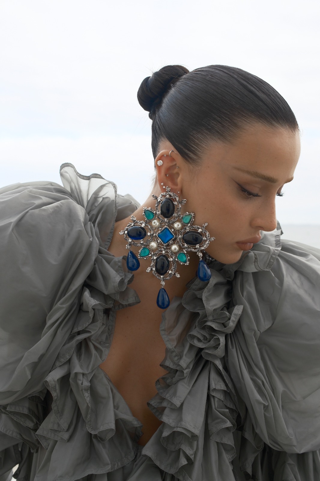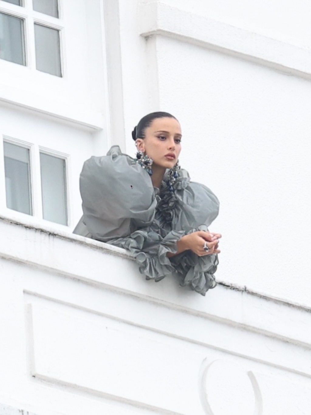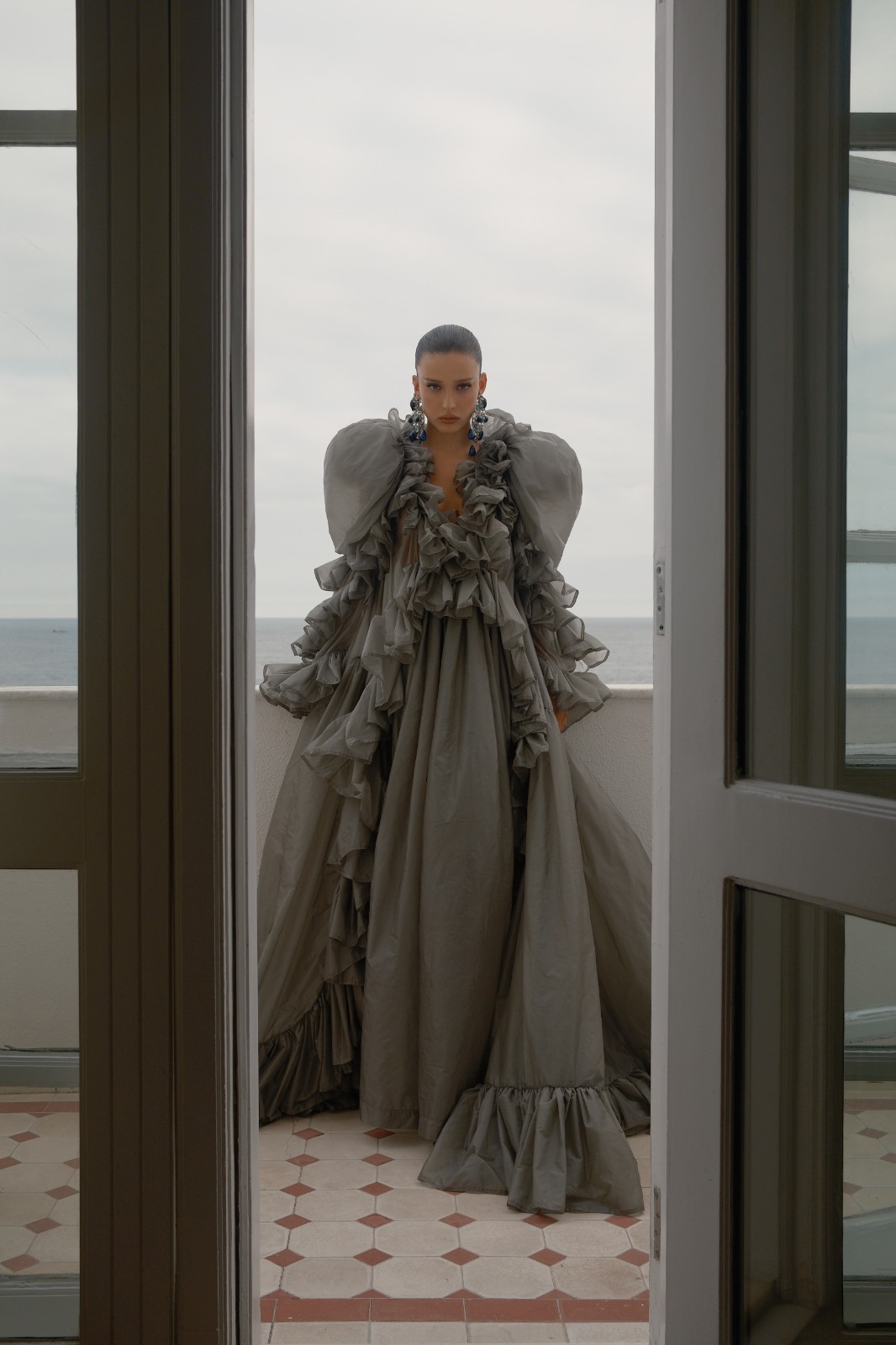 Para a ocasião, Livia apostou em um look impactante da Yves Saint Laurent, coleção Spring/Summer 2026, com styling de Pedro Sales. O vestido cinza longo e transparente chamou atenção pelo volume dramático e pela construção elaborada, com mangas gigot, corpete estruturado e acabamento franzido, além de detalhes como arnês interno com fecho Cassandre e bolsos ocultos.
