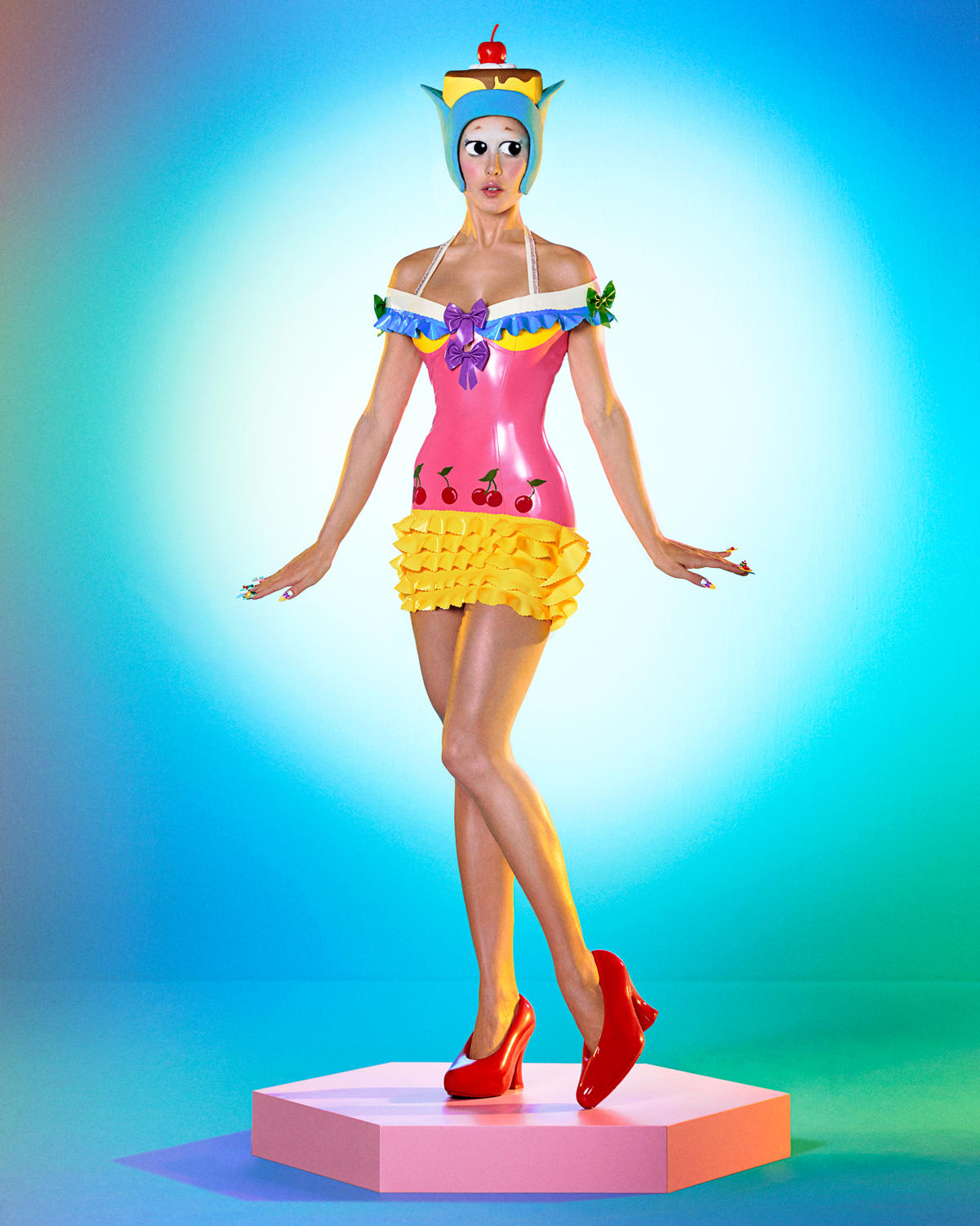 Com styling de Pedro Salles e set design de Jean Leblanca, a produção traz um figurino sob medida em látex assinado pela Poster Girl, evocando o espírito divertido e refinado da cultura toy art.